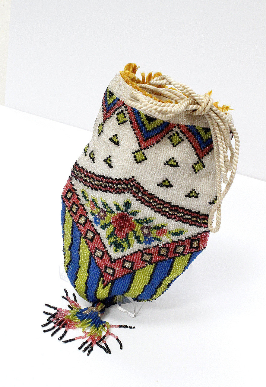 If fun and vintage are both things that you appreciate then look no further than this whimsical multi-coloured glass seed beaded circa 1920s handbag, a reticule complete with twisted silk drawstring handle.