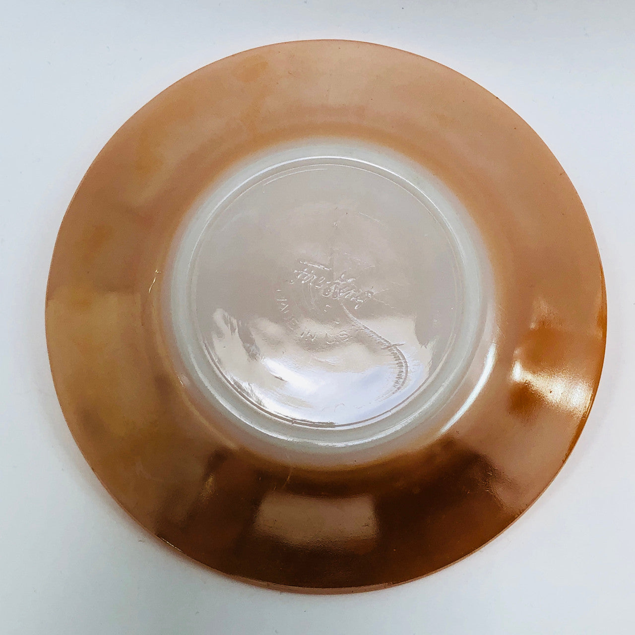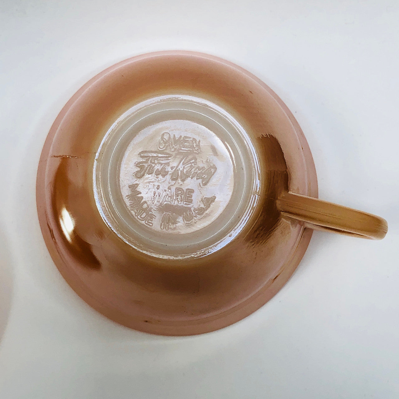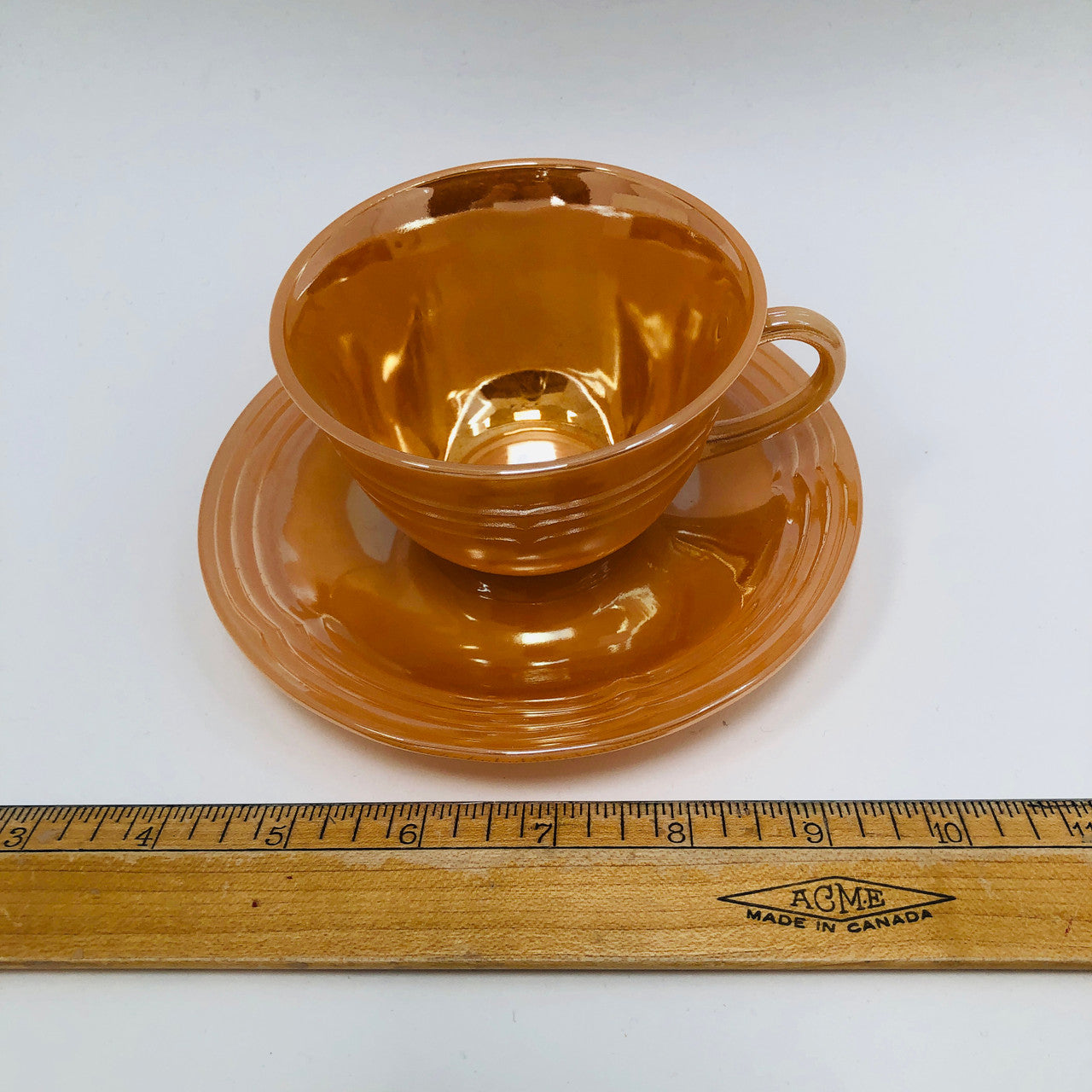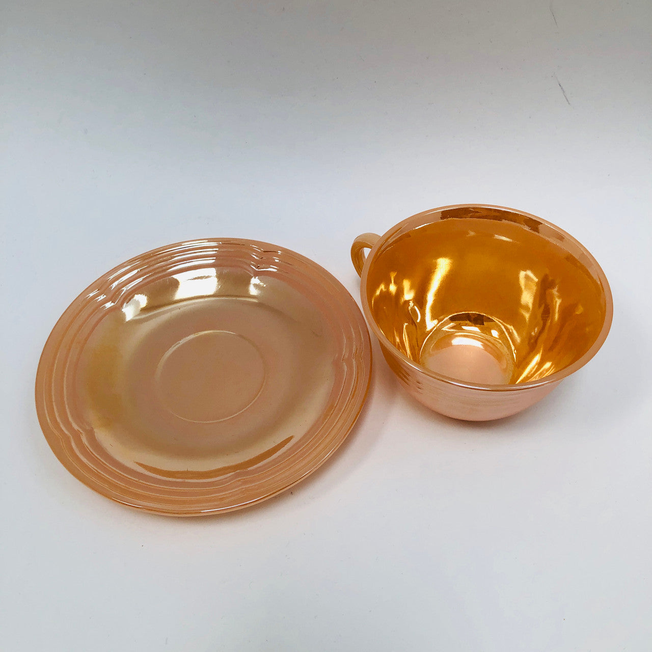 A vintage peach lustre glass cup and saucer from Anchor Hocking (the makers of Fire King).