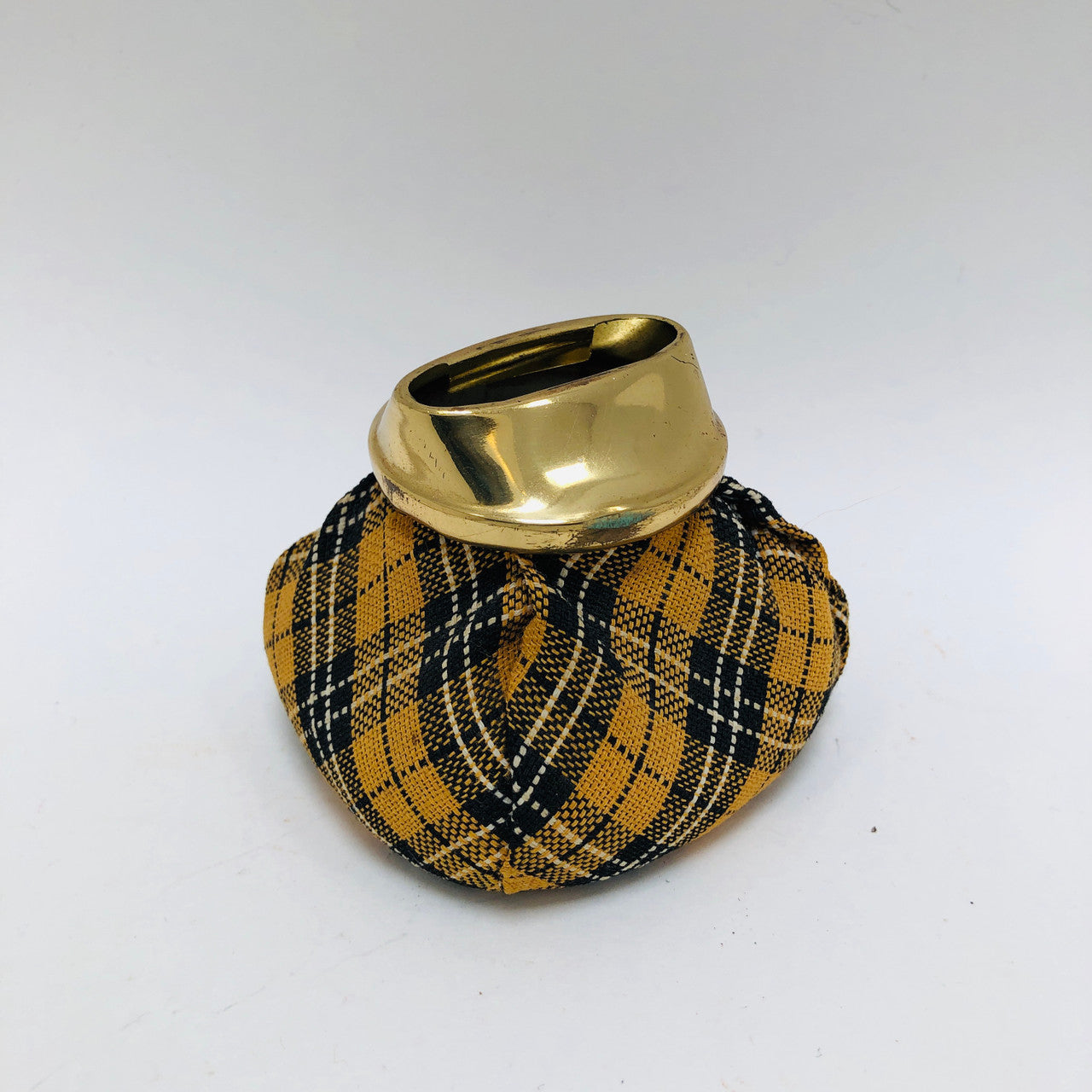 In ochre and black plaid textile with a metal top. The top is slotted to allow cigarette ashes to be dumped within.