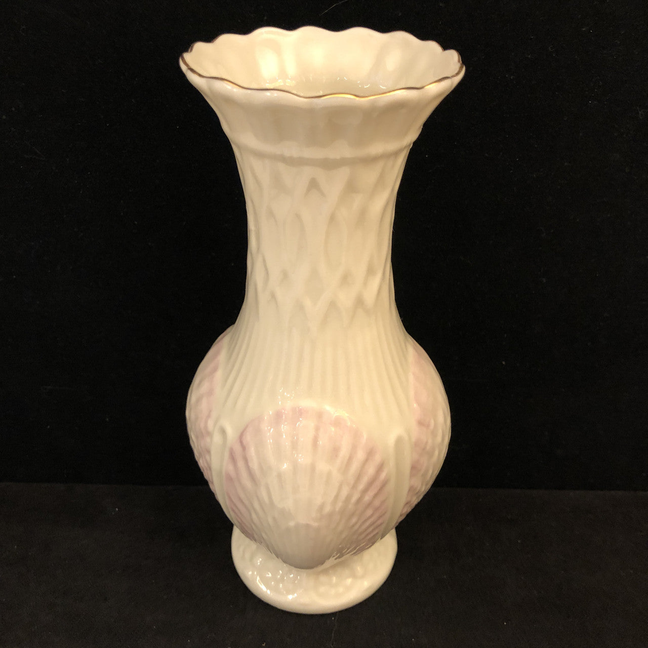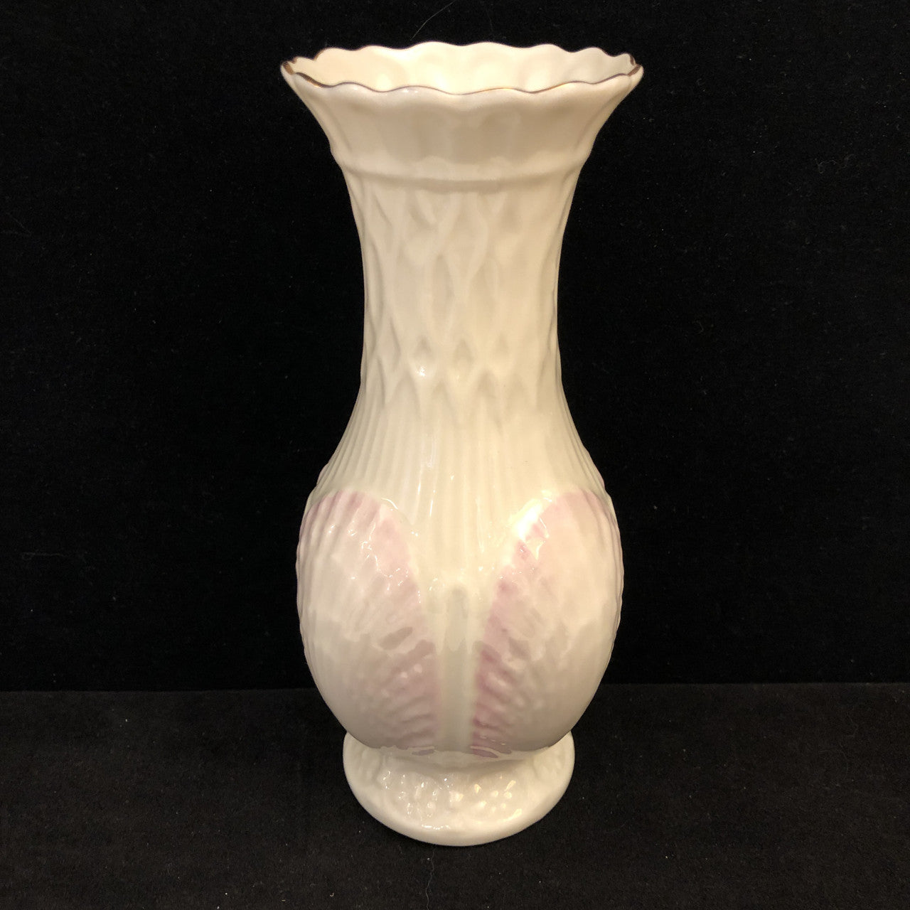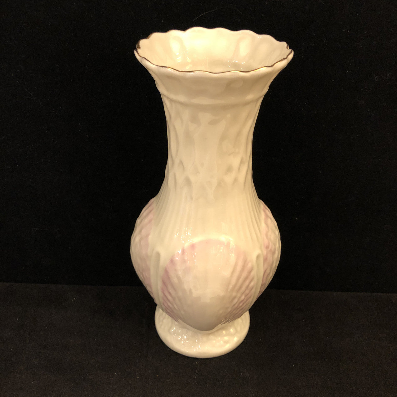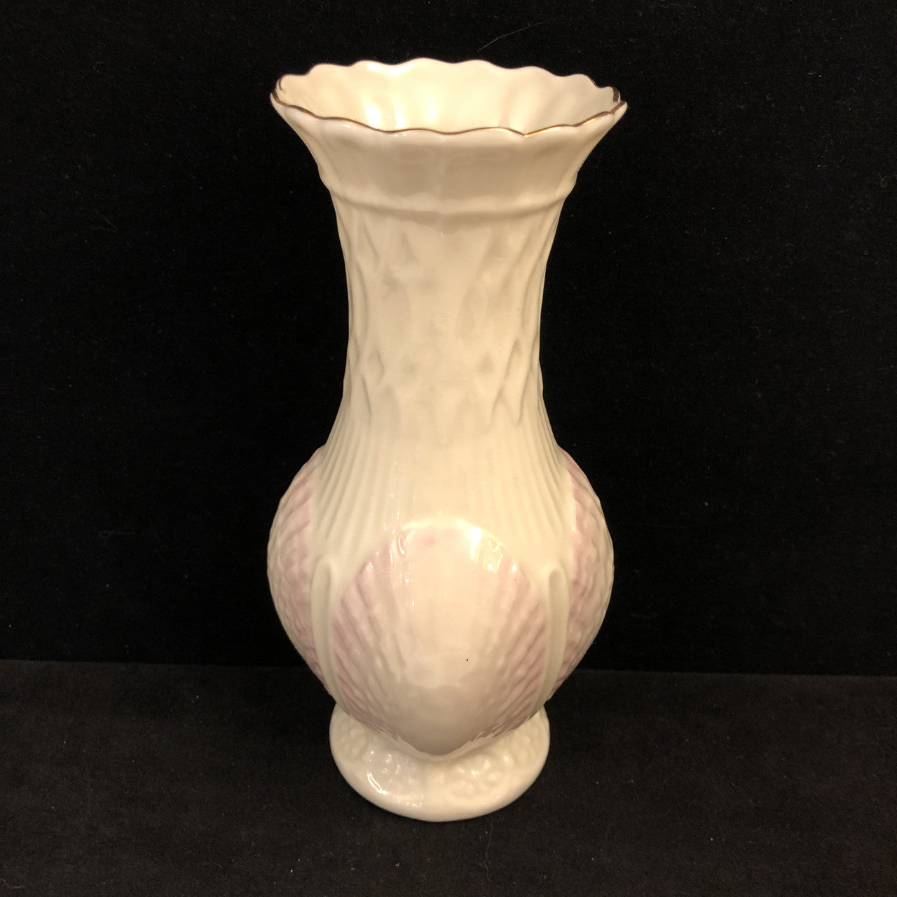 Belleek Pink Shell Vase, with brown mark, manufactured in Ireland by Belleek Pottery Ltd between the years 2008 and 2010.
