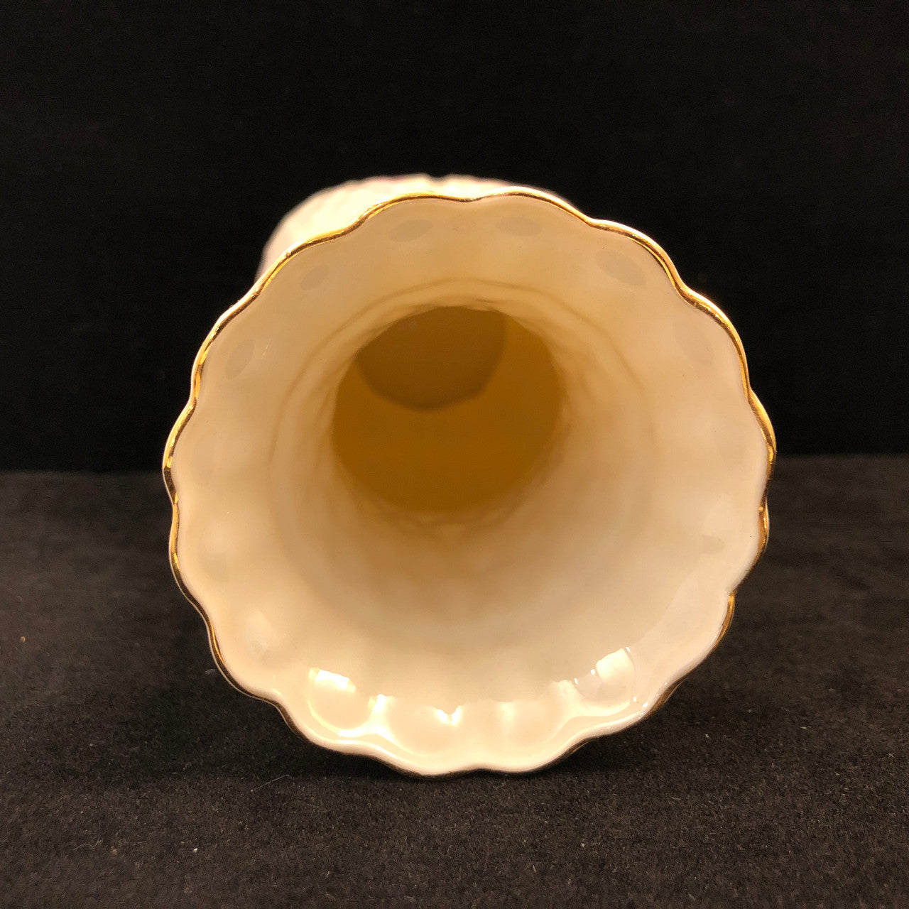 The tapered neck appears to have a ribbed and then cable knit looking pattern before the scalloped mouth of the vase flares out gently to be finished with simple gold trim around the opening of the vase.