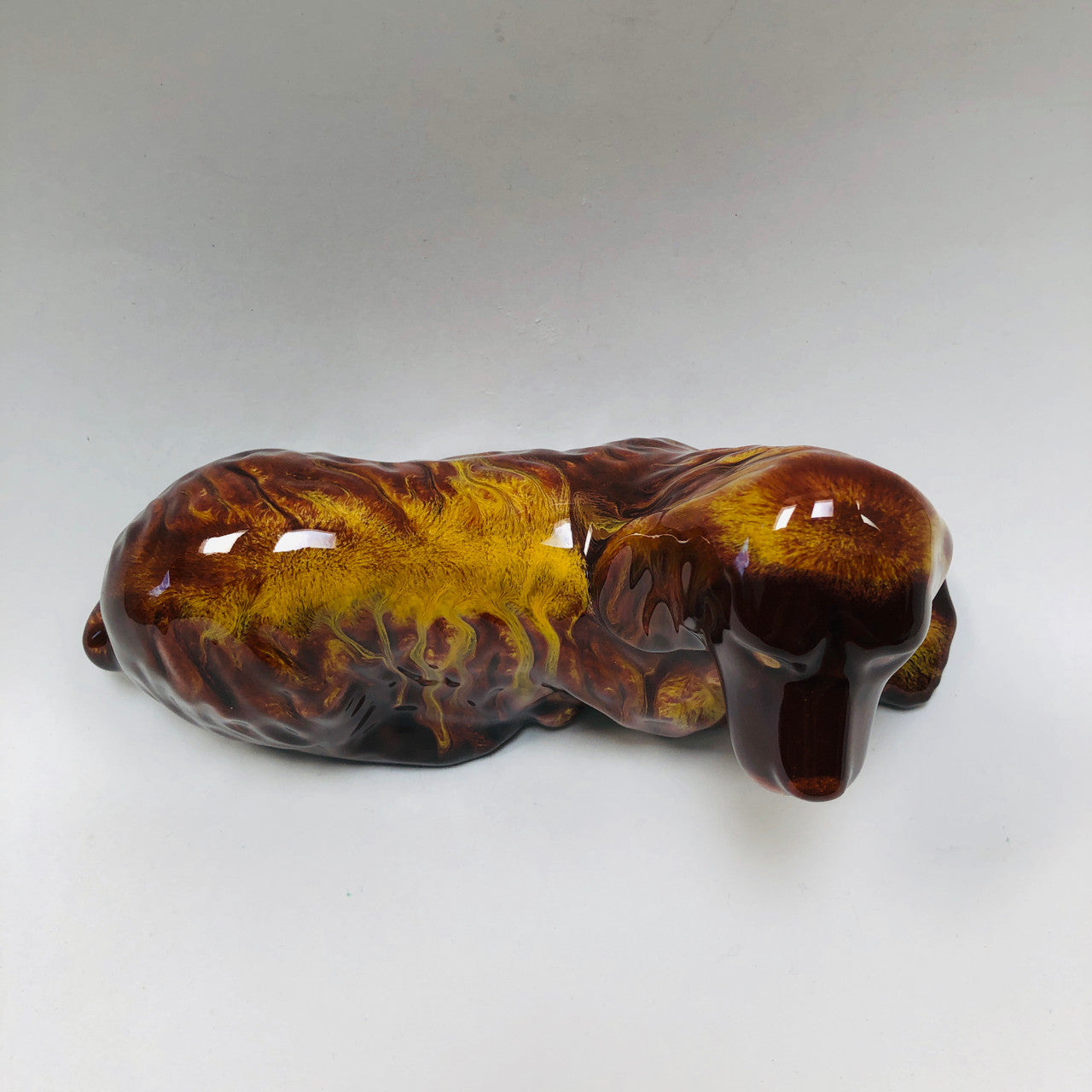 This reclined dog figurine is in the more unusual and more difficult to find "Harvest Gold" glaze with dripped ochre, yellow and brown hues. This is an example of Blue Mountain work which was produced in the 1960's.