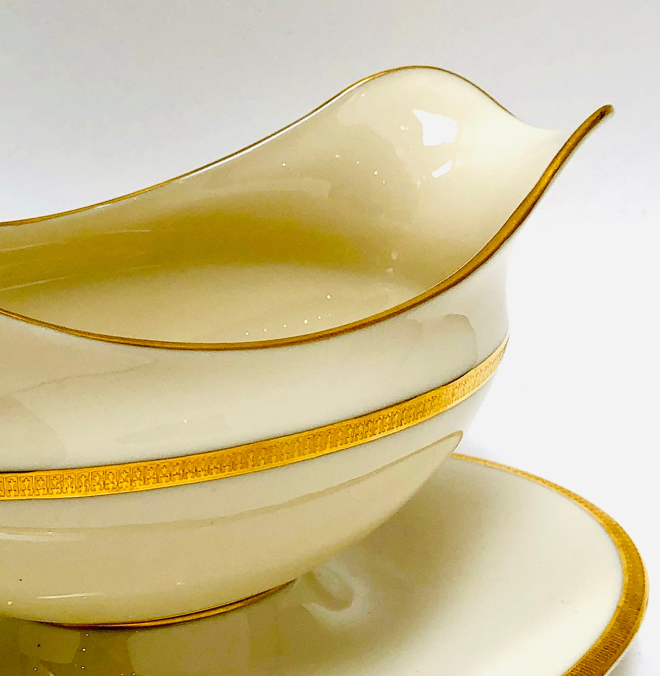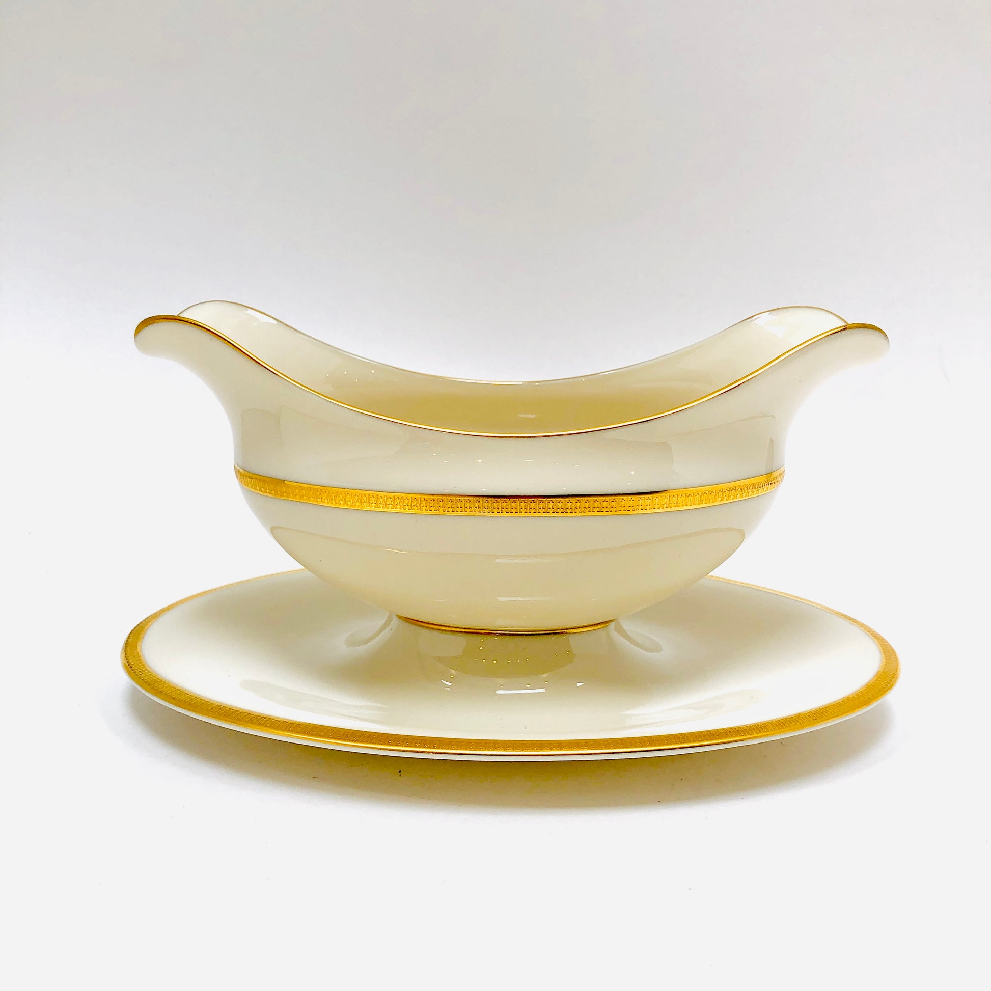 A fine vintage gravy boat and attached oval liner from Lenox Inc. (USA) in the Tuxedo pattern.