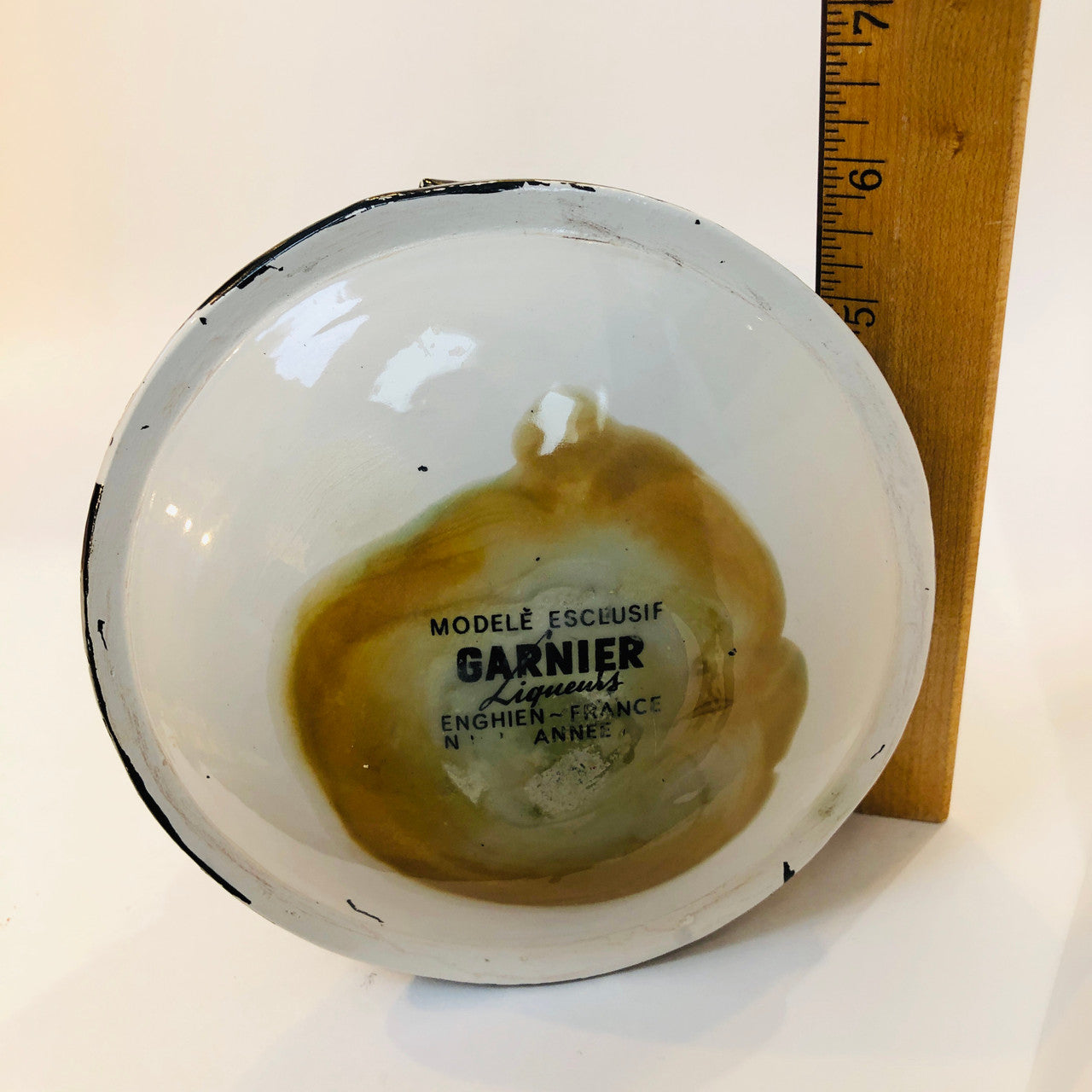 The bottom of this decanter retains its original label: "MODELE ESCLUSIF GARNIER LIQUEURS ENGHIEN~FRANCE...ANNEE".