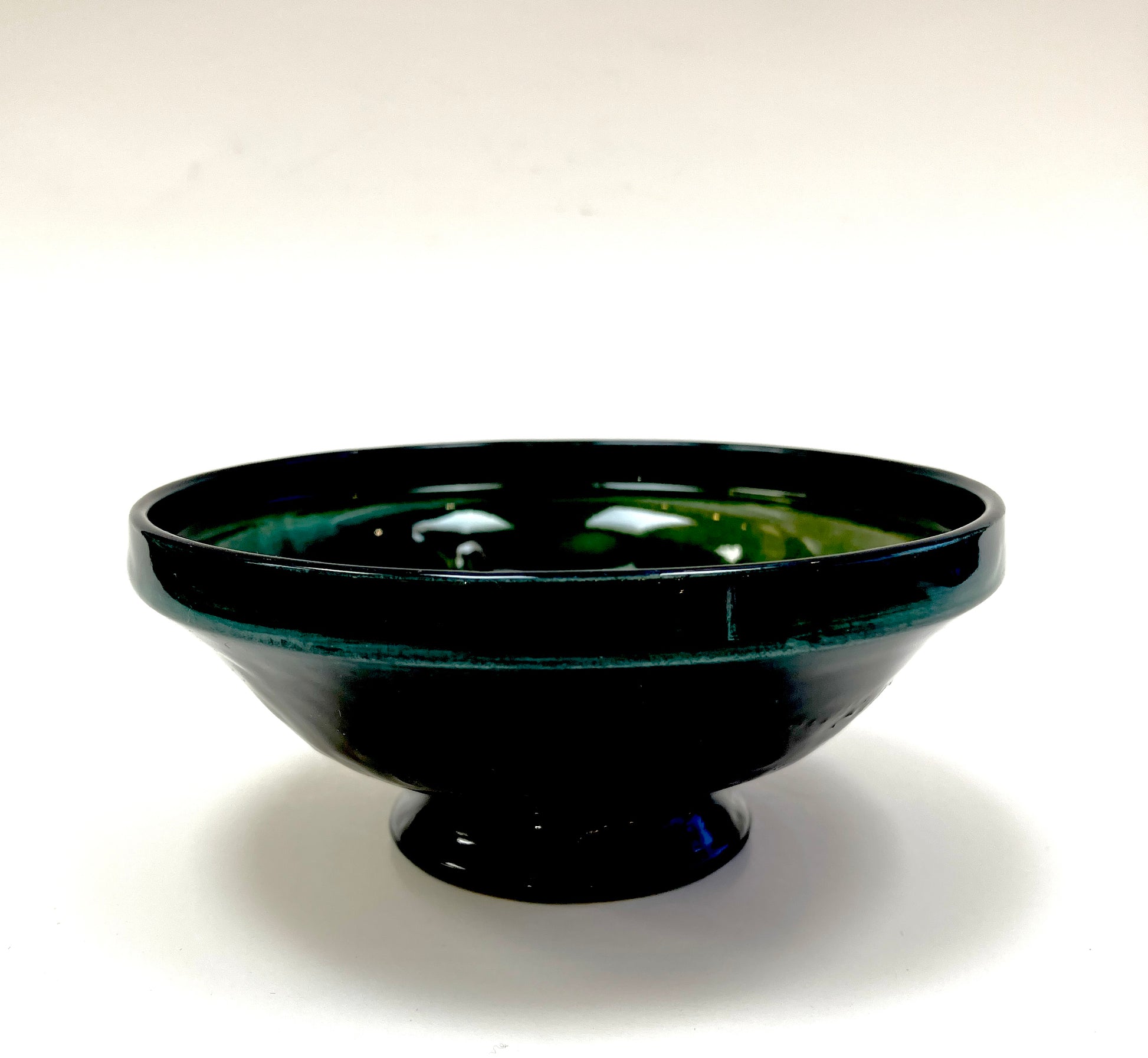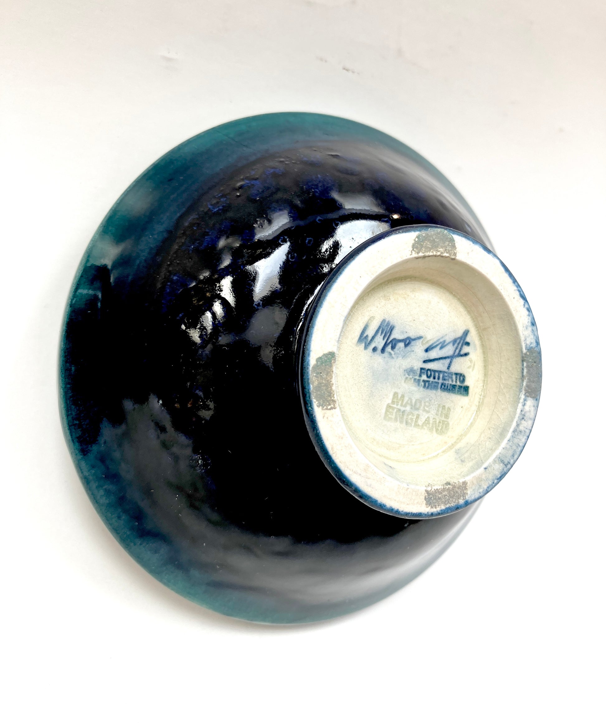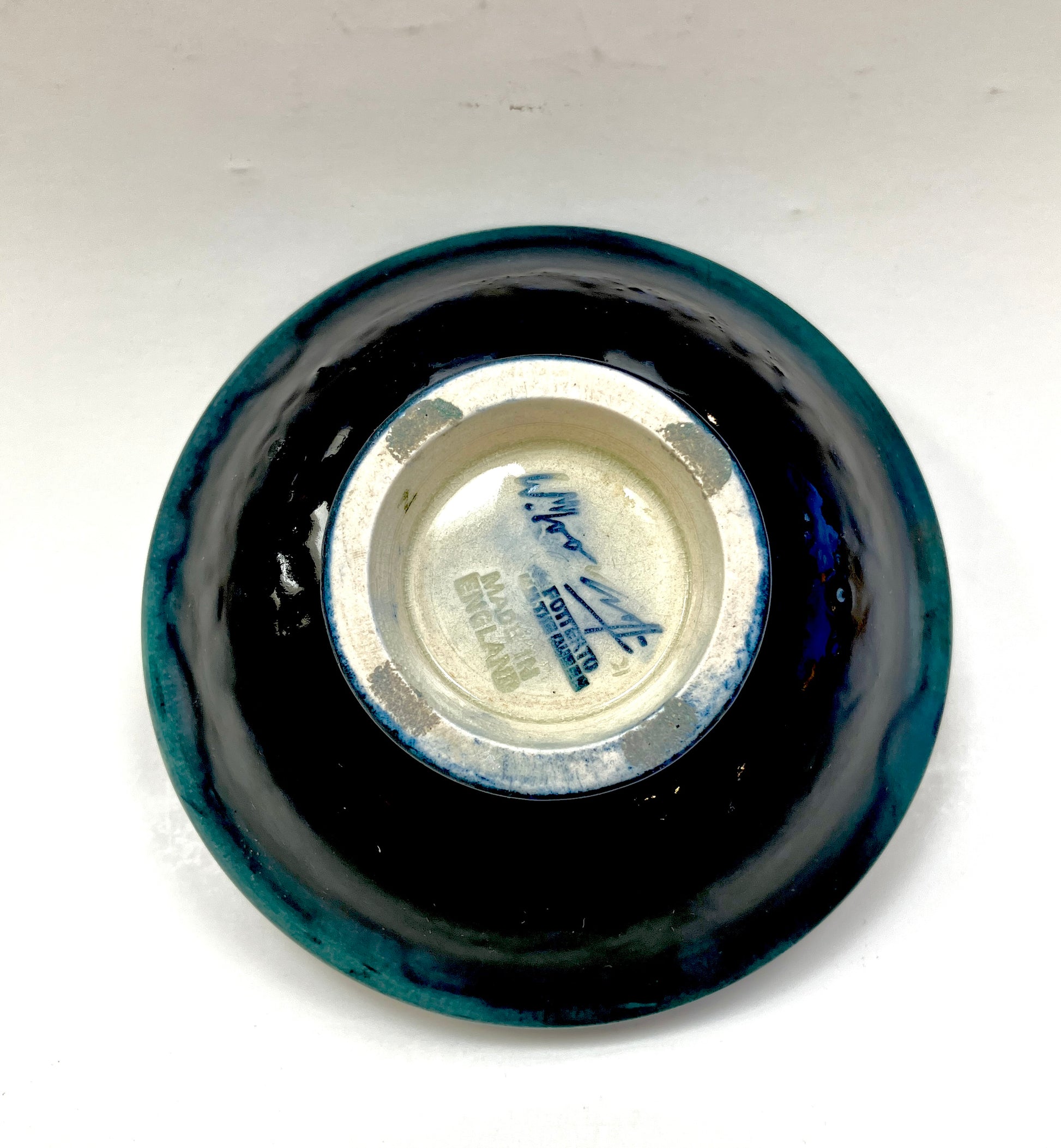 A vintage (~1940s) pretty little reddish Anemone on a graduated dark green/cobalt blue background pattern footed bowl from Moorcroft (England).