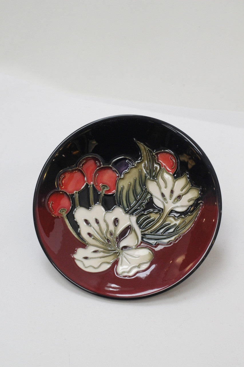 A tound Moorcroft Cherry Blossom Tray (780/4) by Moorcroft artist Nicola Slaney. 2012 to 2013.
