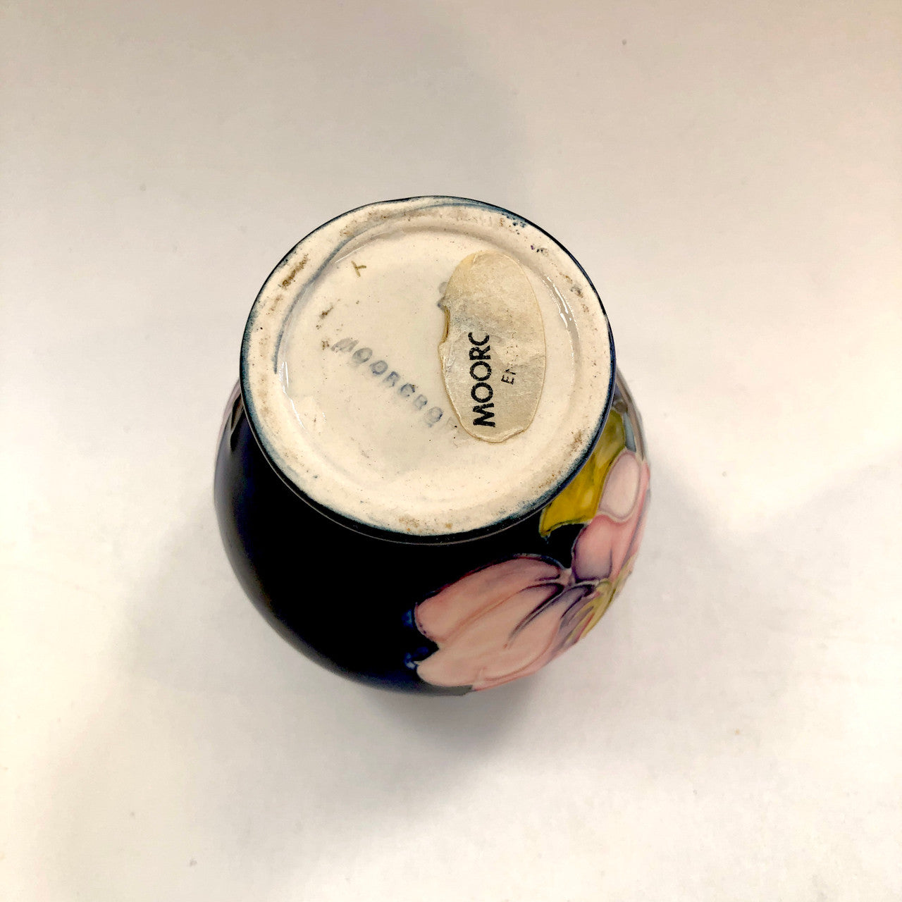 The underside of this vase is stamped in blue: "MOORCROFT". A partial oval paper Moorcroft sticker also remains adhered to the bottom of the vase.