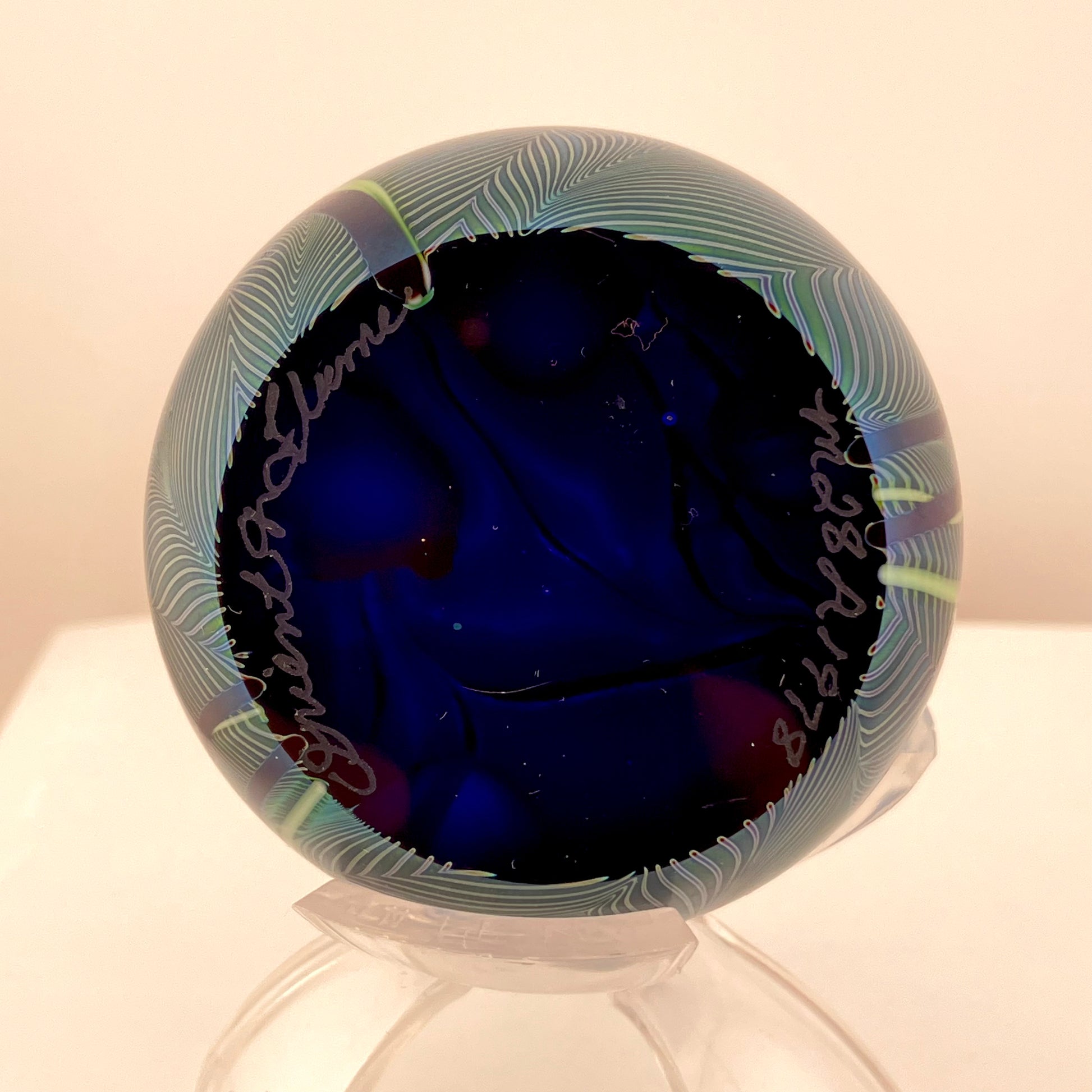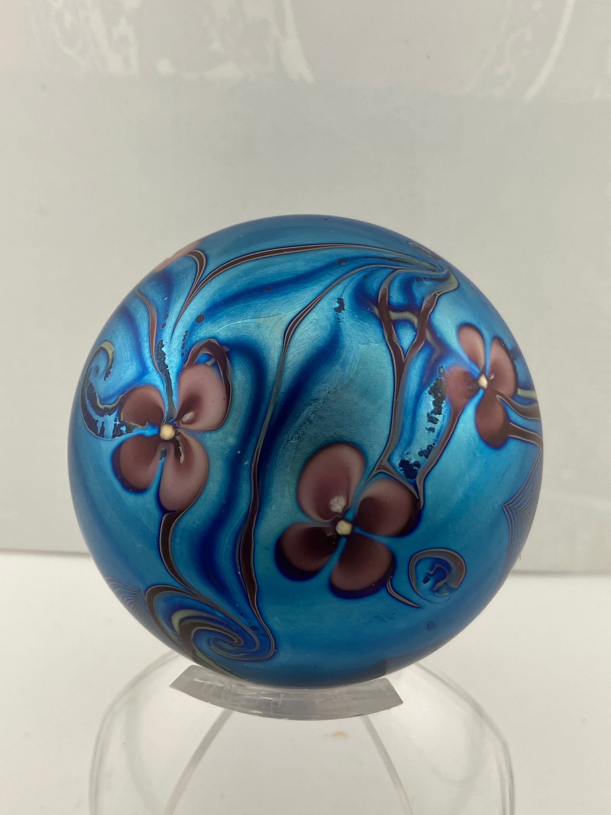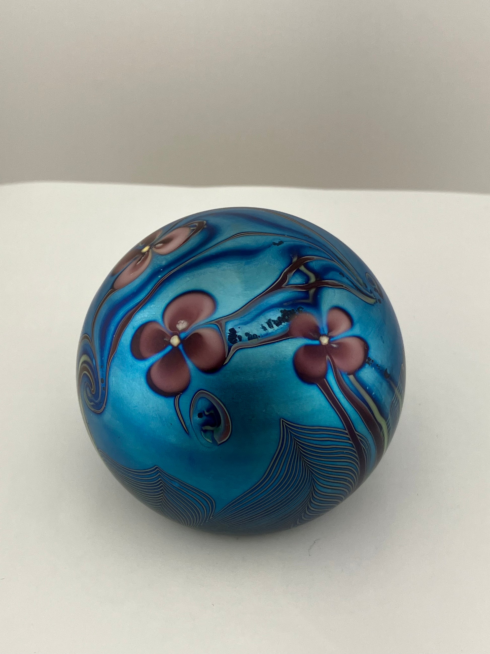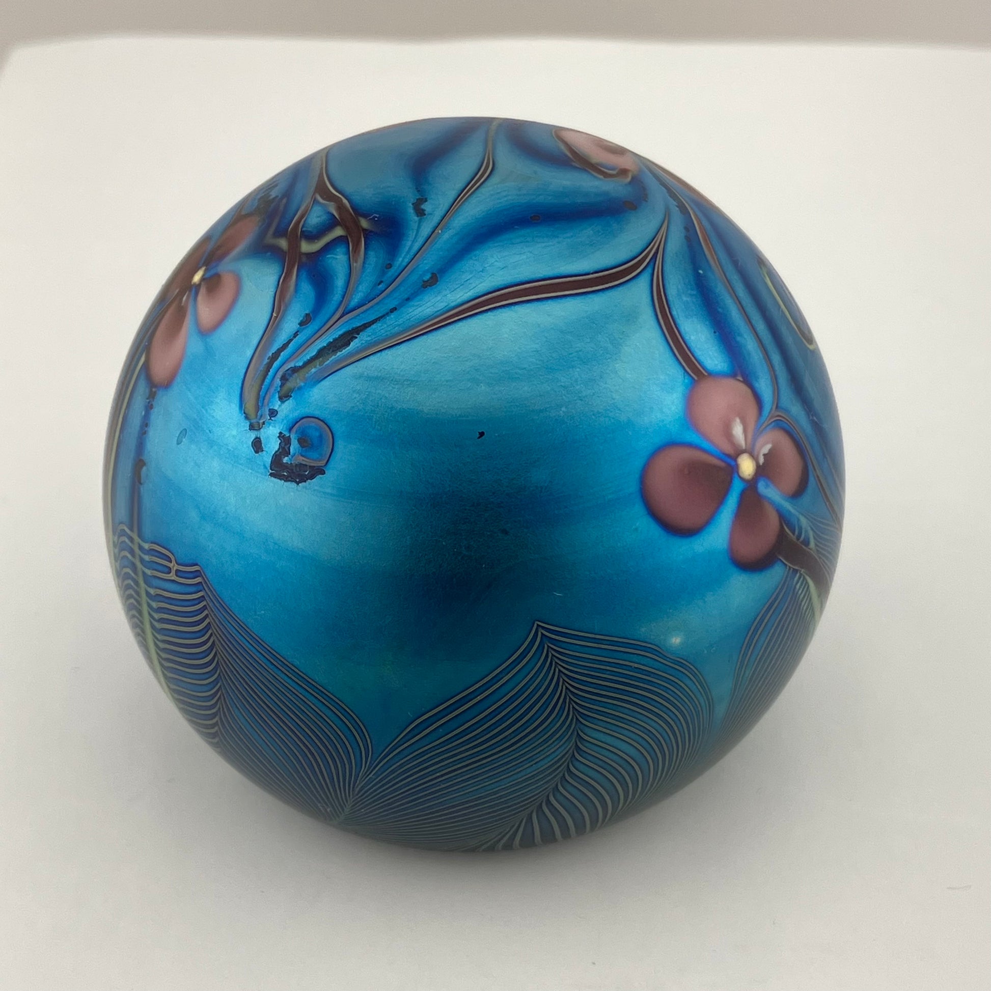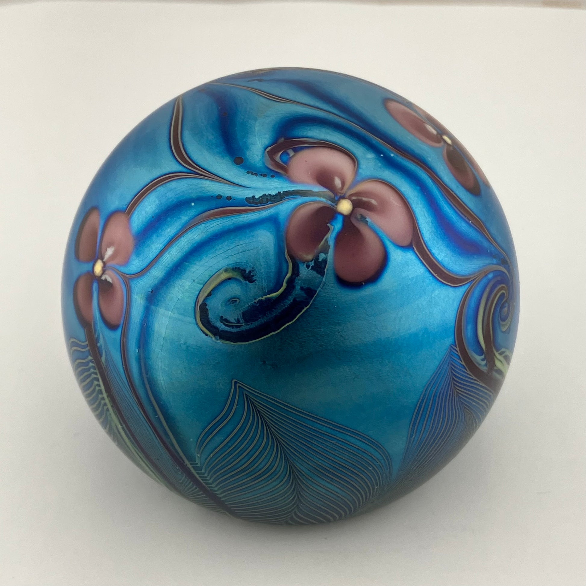 Orient and Flume Studio, Glass Paperweight, Round, Iridescent Dark Peacock Blues with Pink Flowers and Feathered Embellishment.