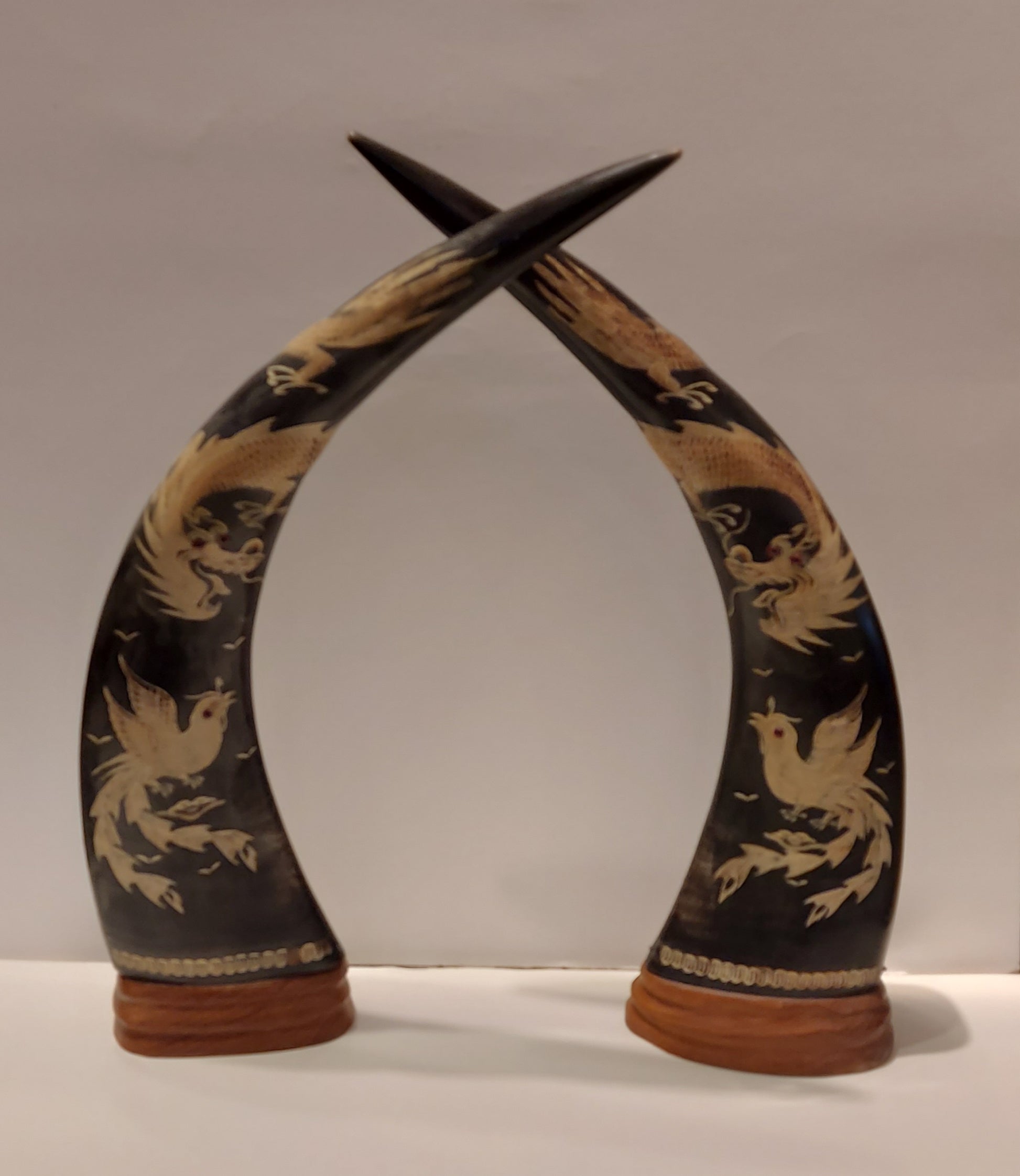 Pair of vintage decorative water buffalo horns on wood bases, hand carved dragons and birds, oriental style, glass eyes, each set upon a wood base.
