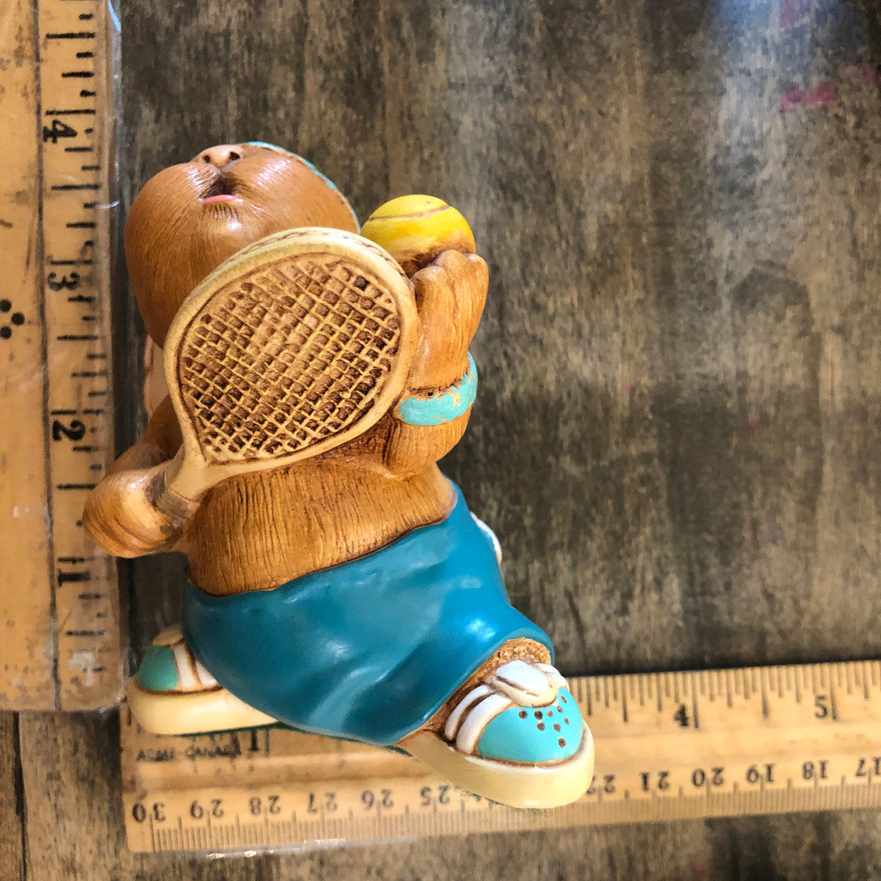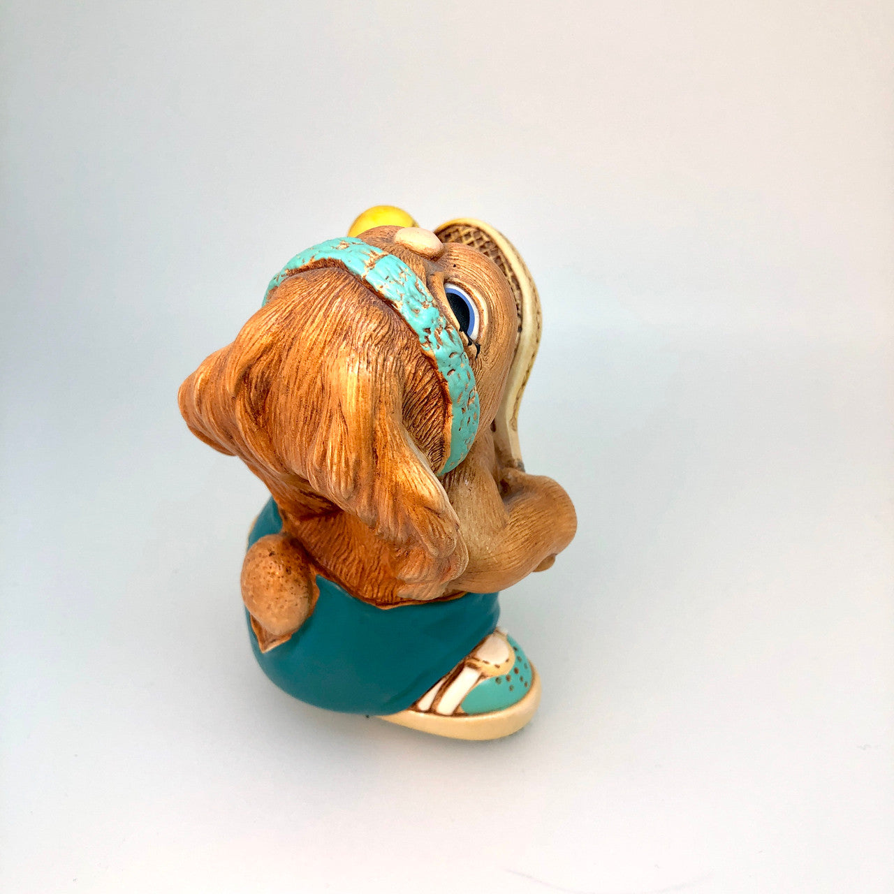 Features an cute little shirtless anthropomorphic rabbit of ceramic stonecraft, wearing dark green/turquoise pants, (RARE), a light turquoise head band, and turquoise and white tennis shoes.