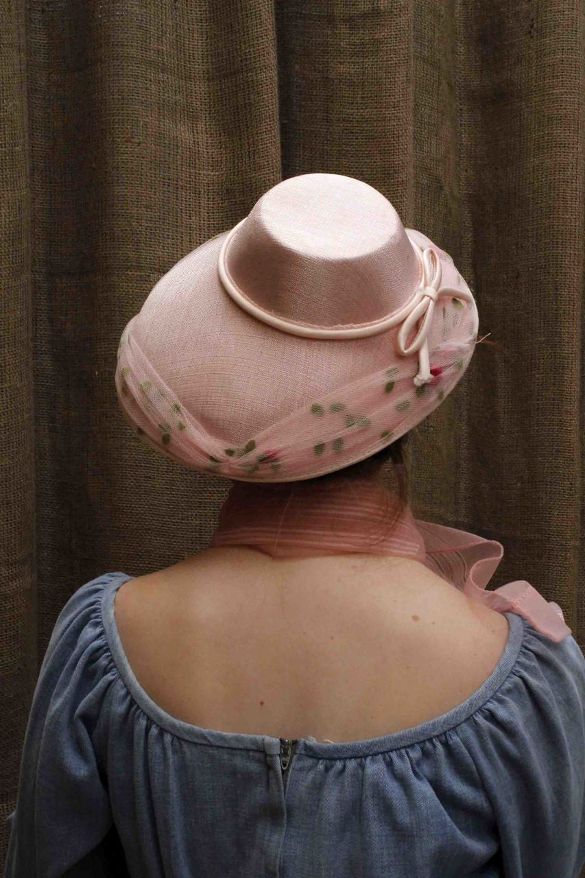 A beautiful pale pink hat speckled with leaves and rosebuds along the bottom rim.