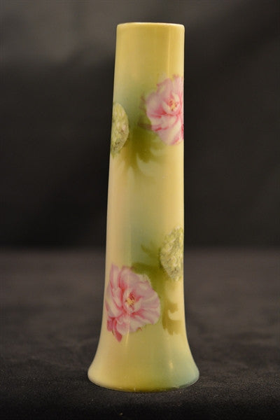 Pastel hued soft yellow vase with green and pink rose floral transfer images forefront only. The back is unadorned.