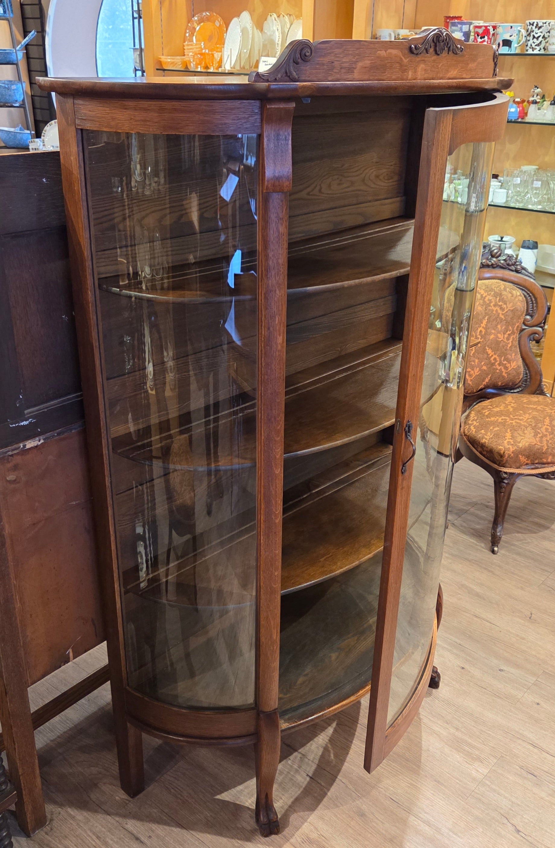 Victorian rounded glass cabinet, rounded glass sides and front door, wood shelves.