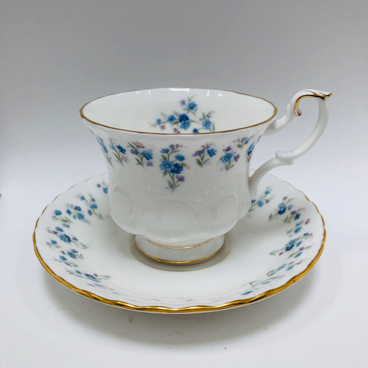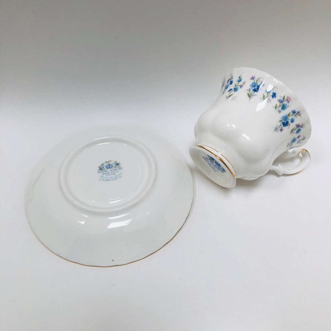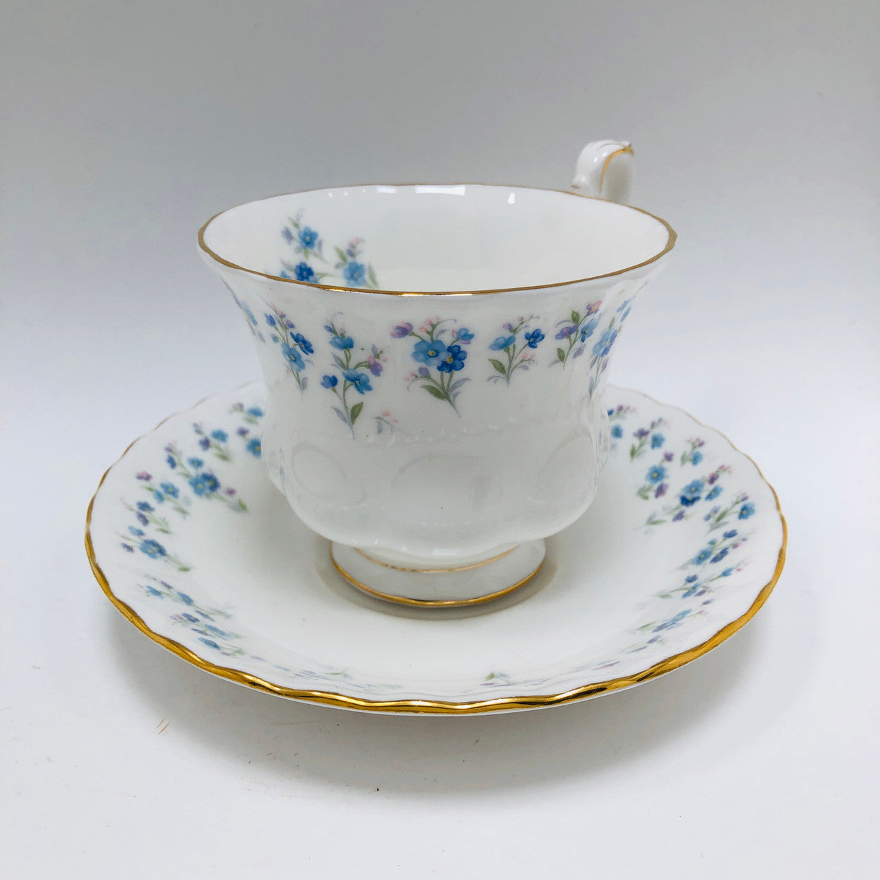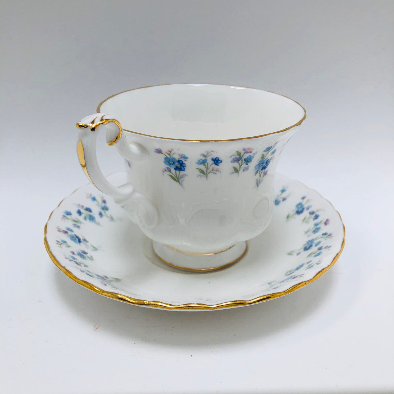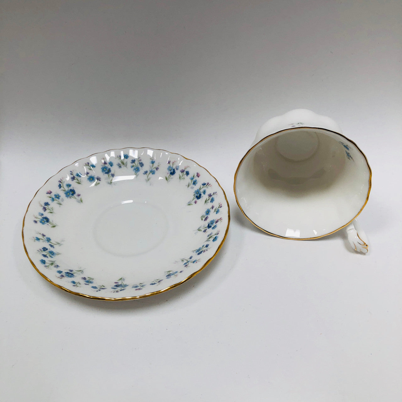Little sprays of blue forget-me-not blossoms are attractively strewn about the borders of both the cup and saucer on this vintage item.