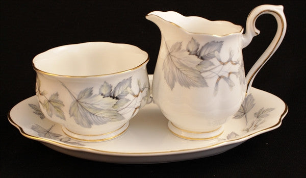 A vintage creamer, sugar bowl, and tray from Royal Albert in the gorgeous Silver Maple Pattern, fine bone china.