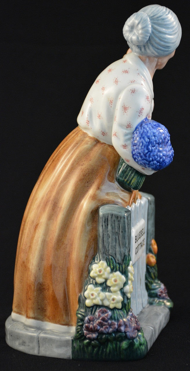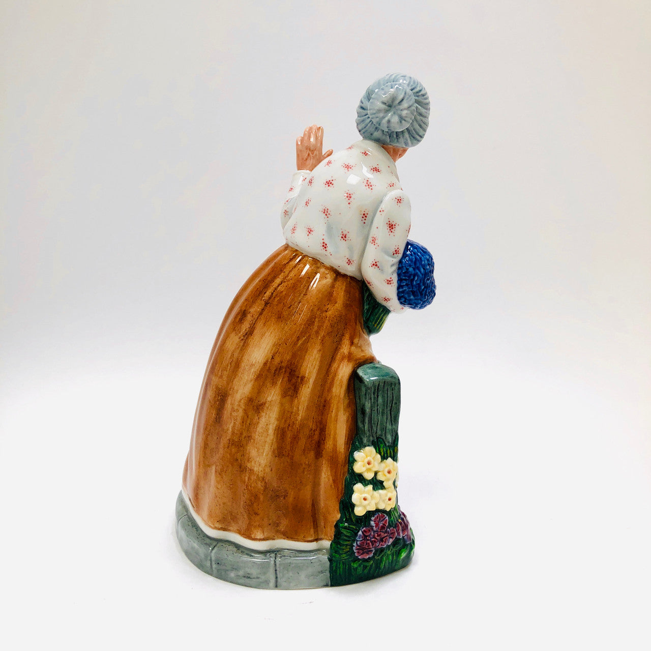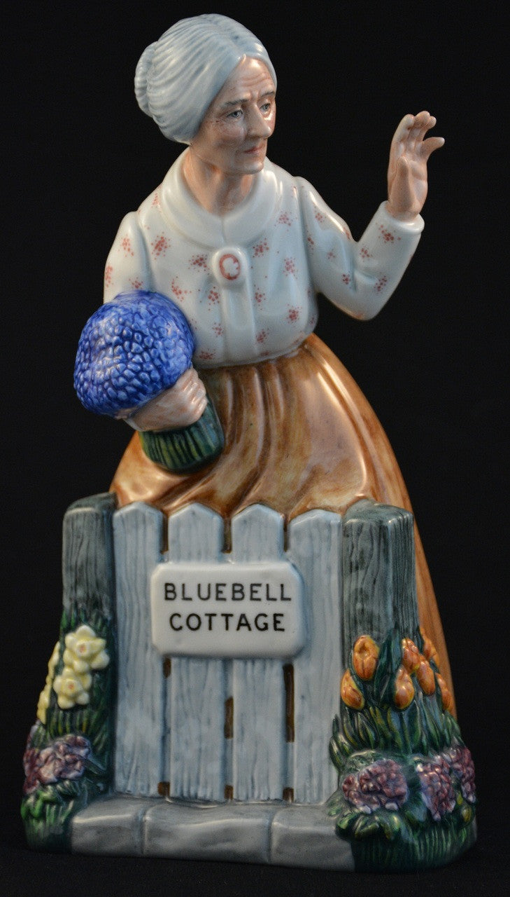 This Royal Doulton figurine, "Thank you" (HN 2732), depicts an elderly woman waving from behind her picket fence. A sign on the fence reads "Bluebell Cottage."