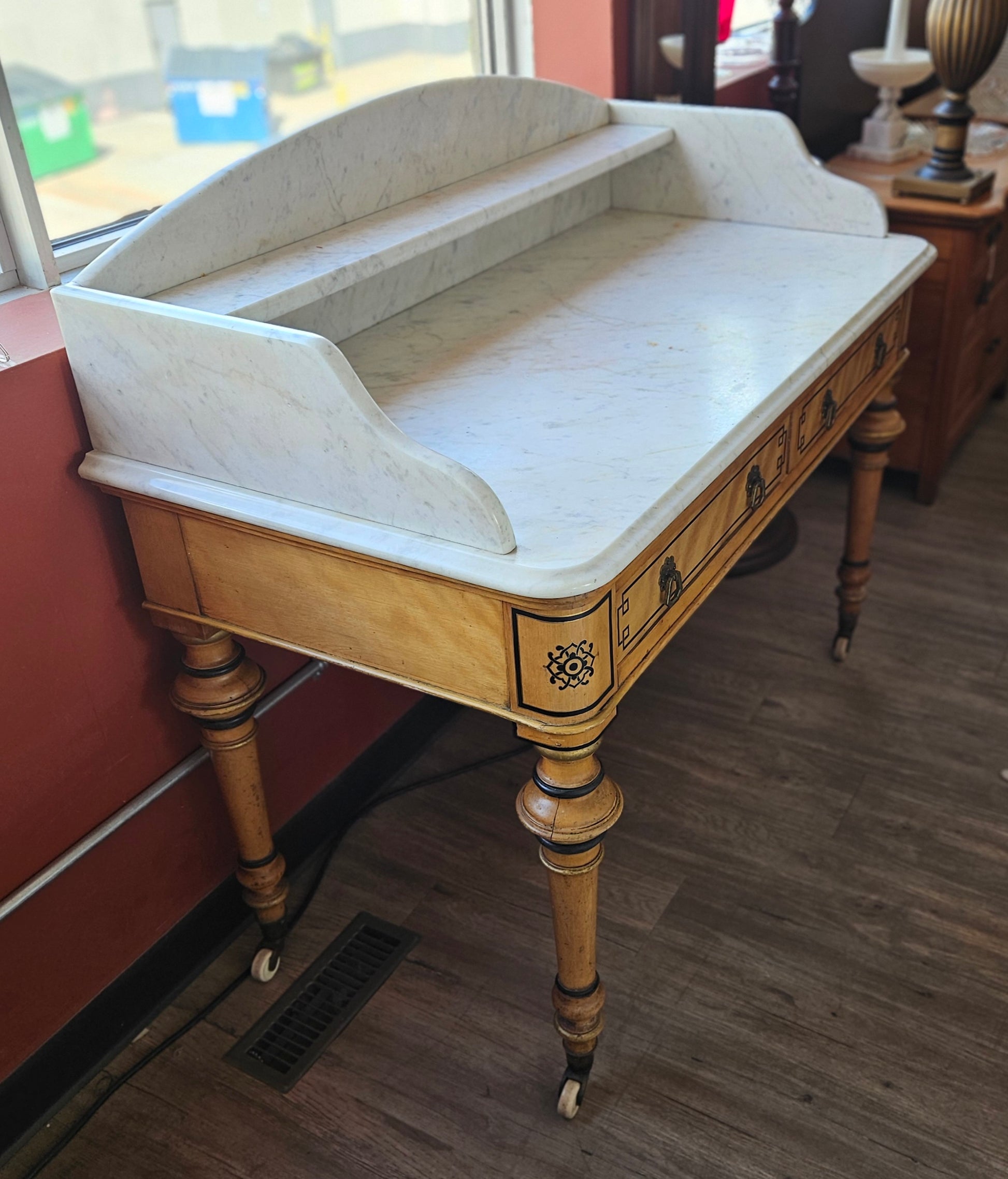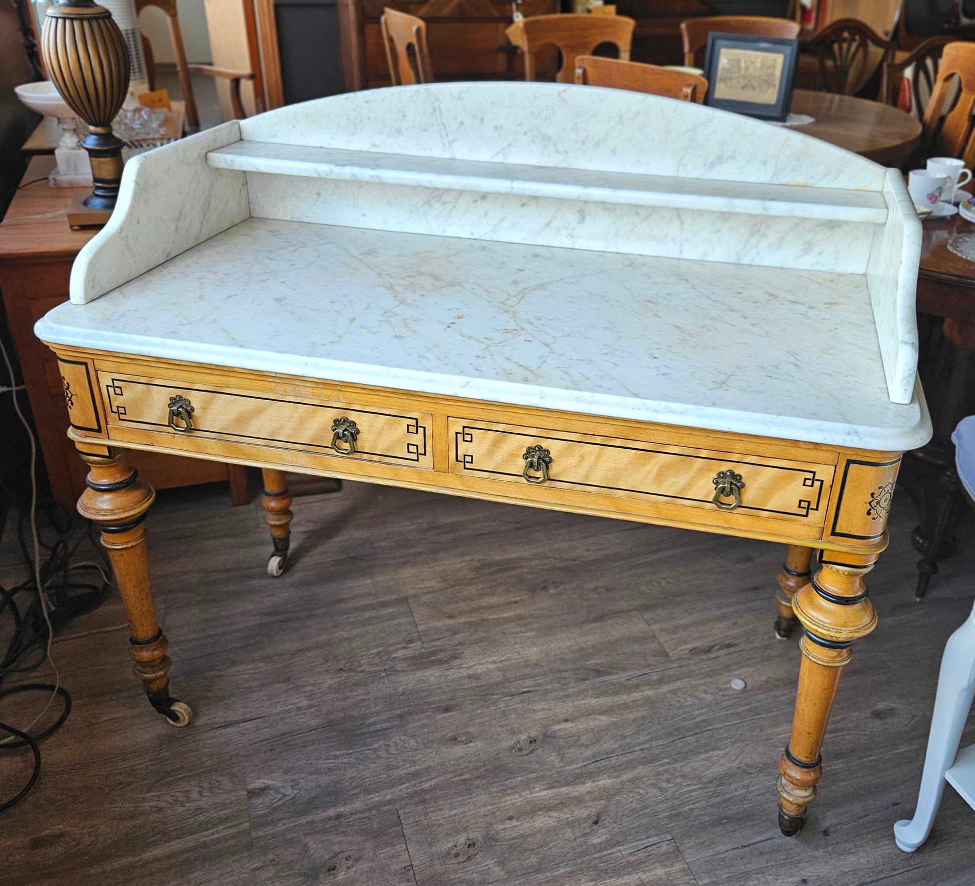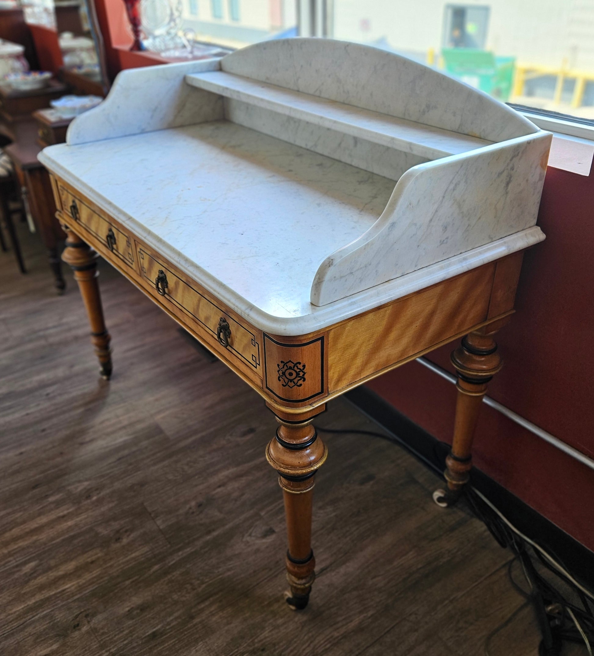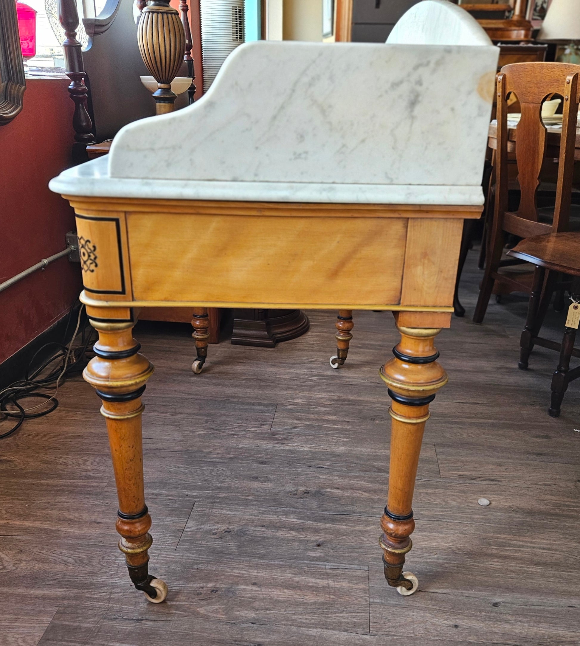 Antique washstand, 2 drawers, original wheels, significant marble top with marble shelf, back and sides, patterned veneer on solid wood base, Victorian.
