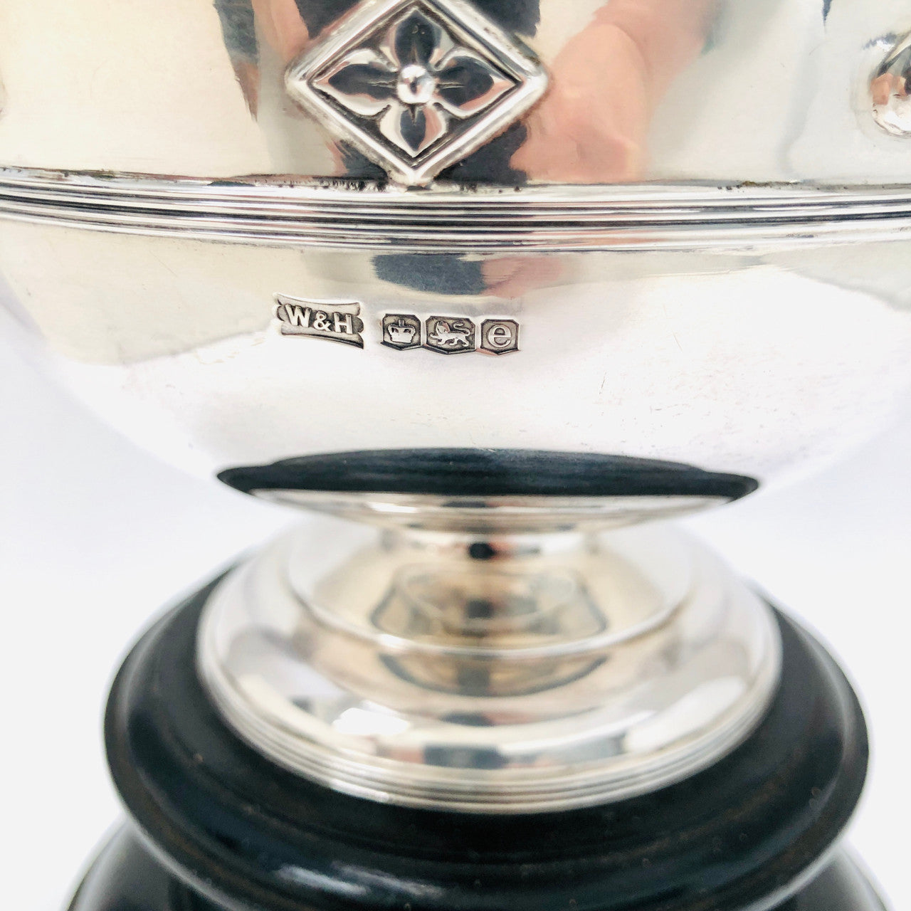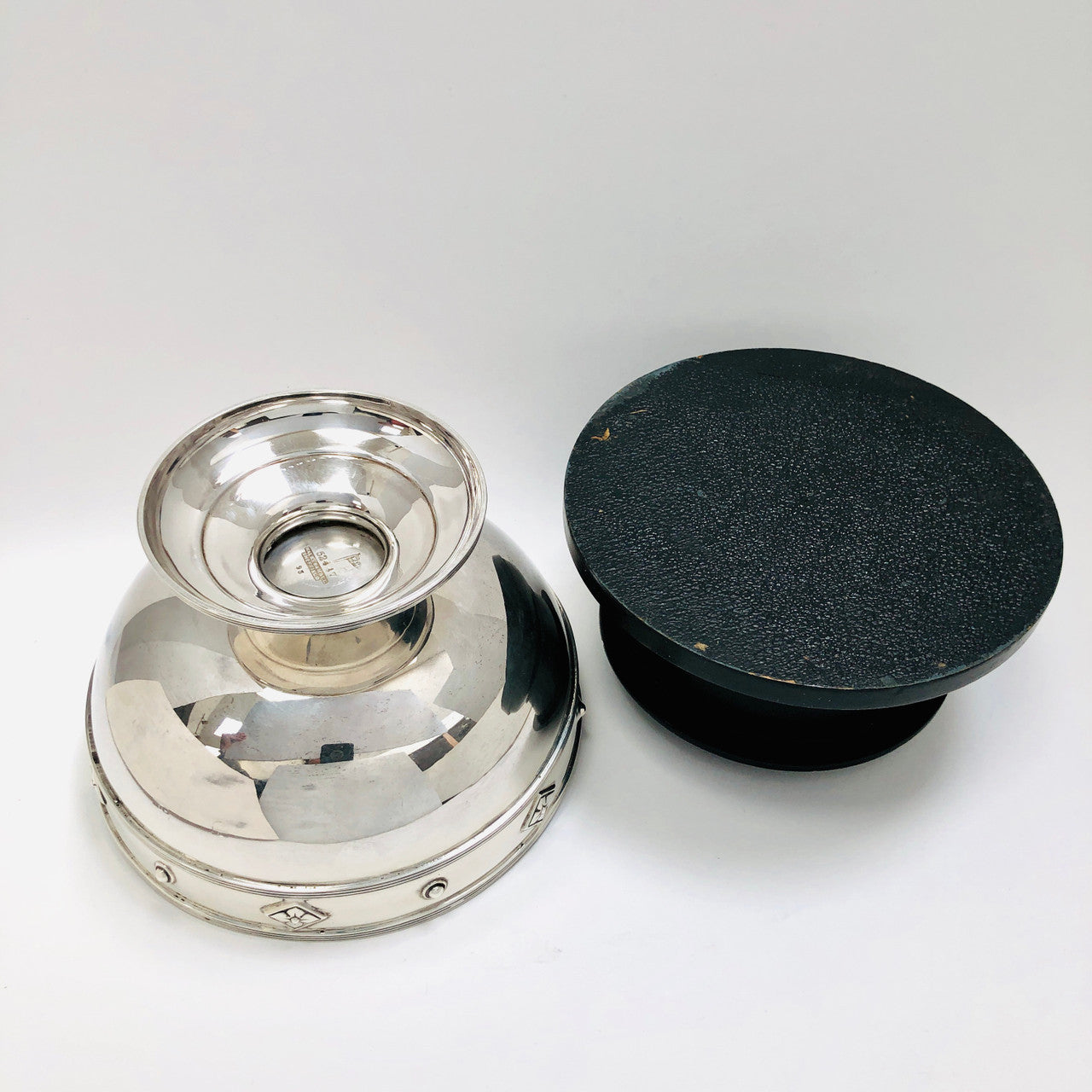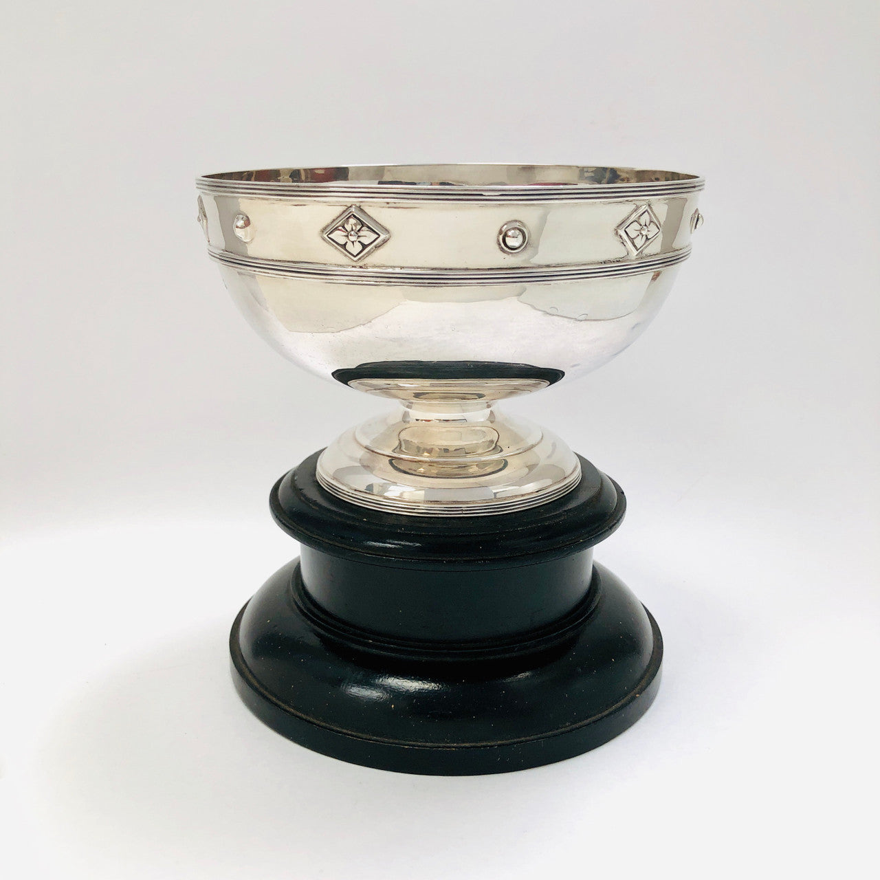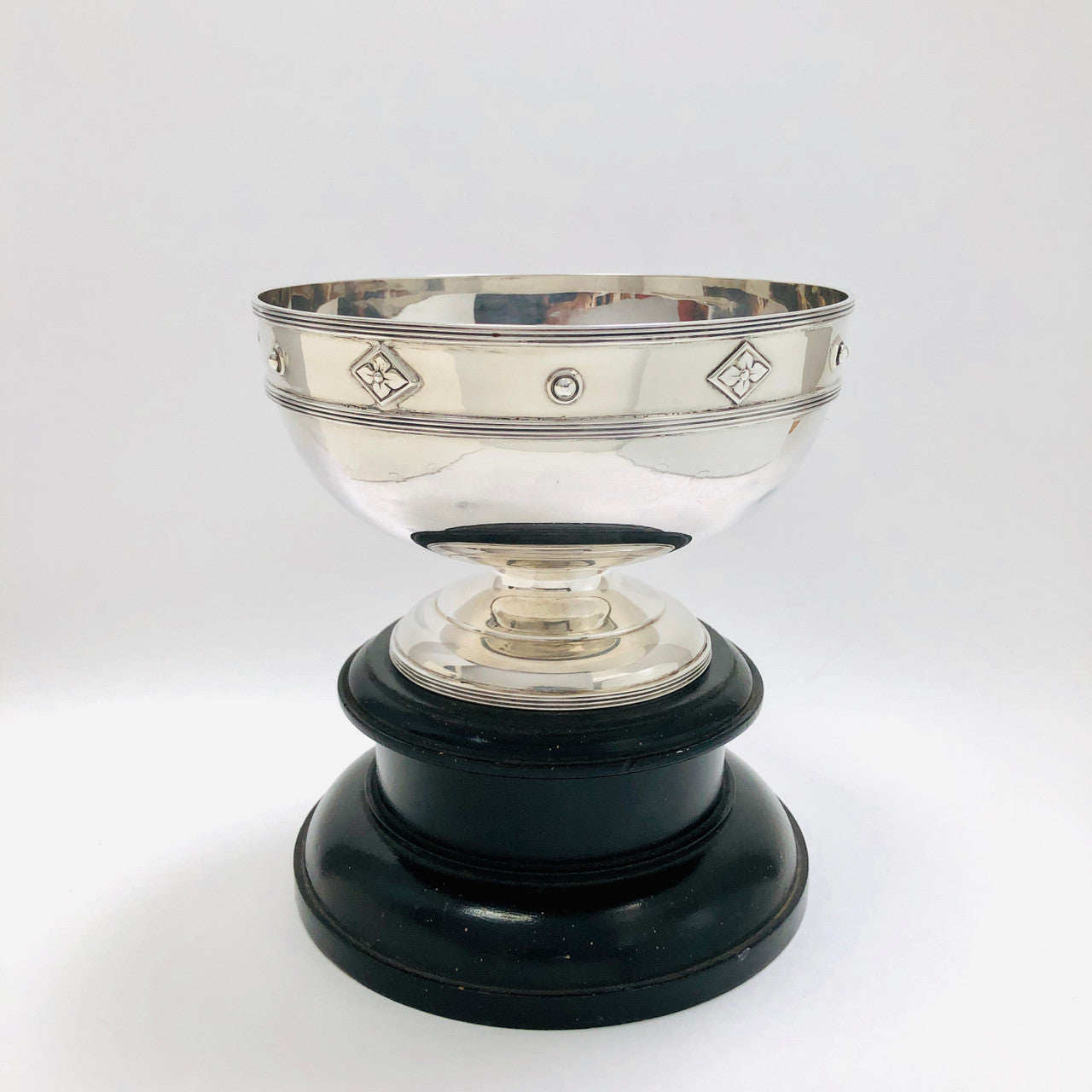 A large sterling silver cup with fitted black wood pedestal.