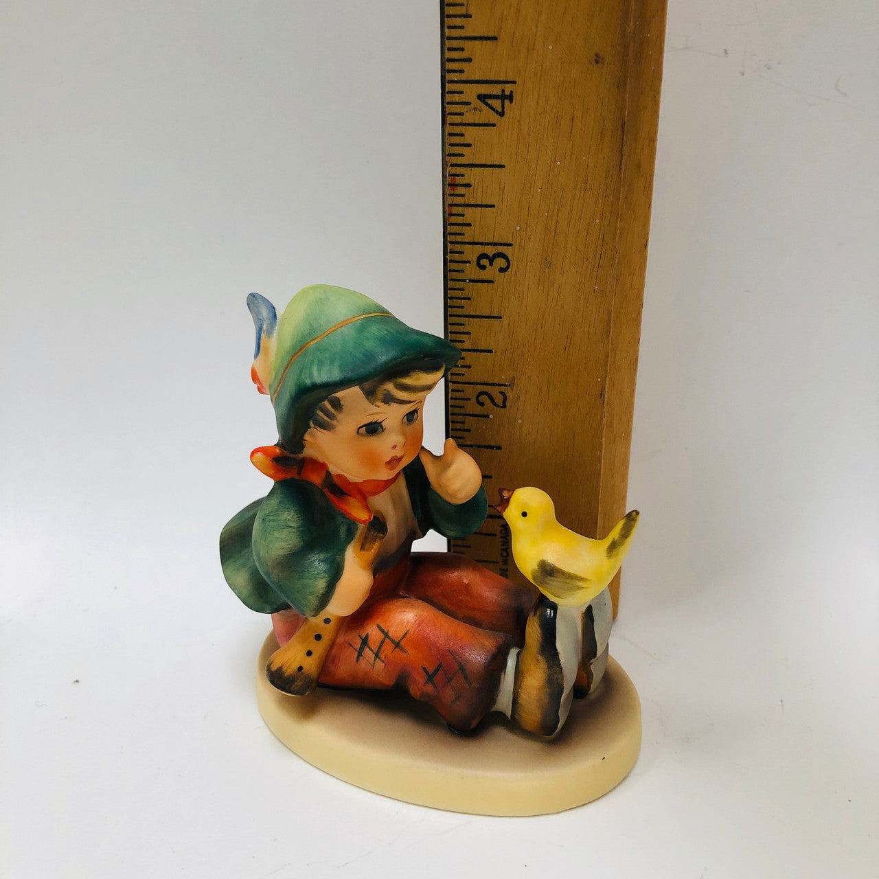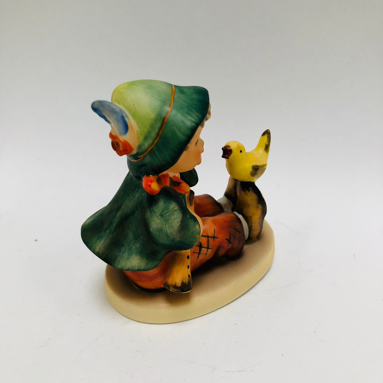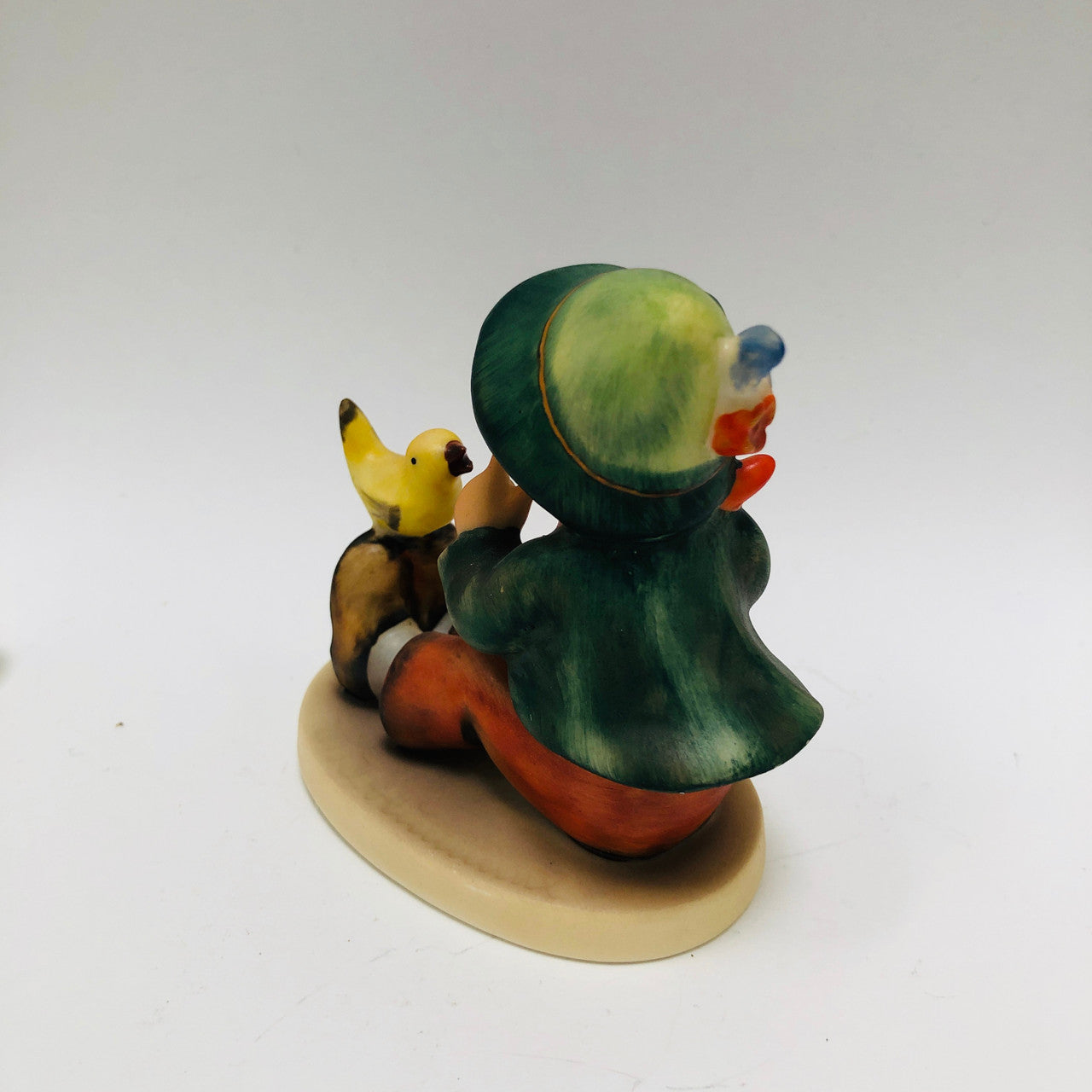 Goebel Hummel figurine - boy sitting on ground with horn, teaching bird, "Singing Lesson", vintage, 1972 to 1979. TMK5