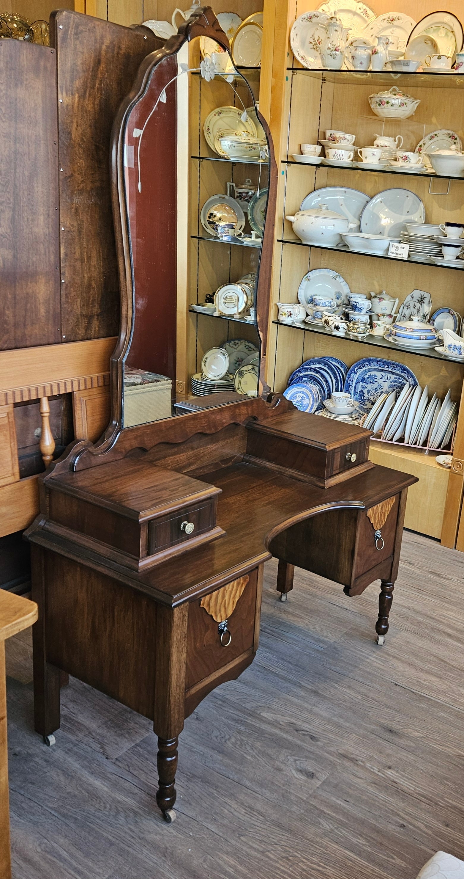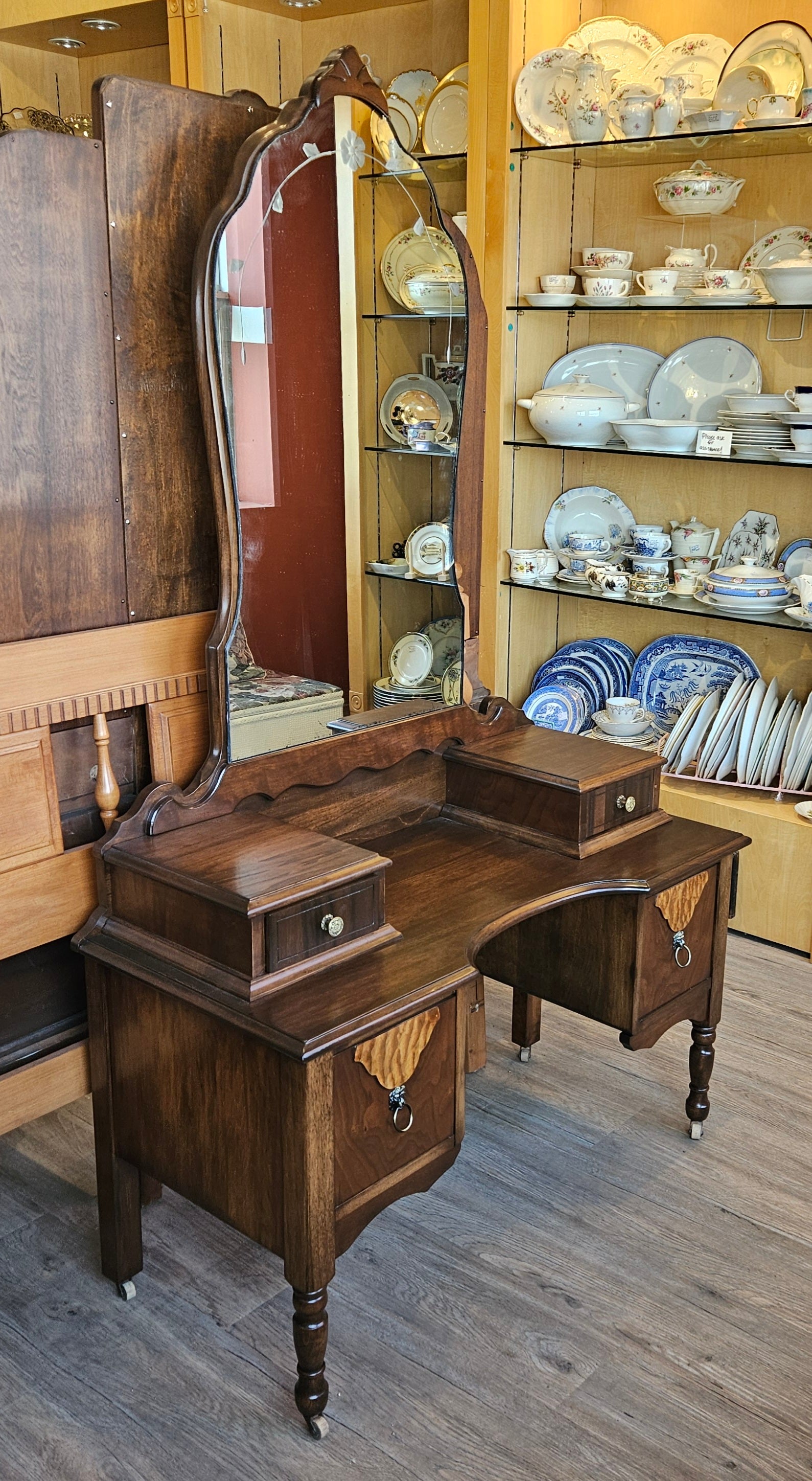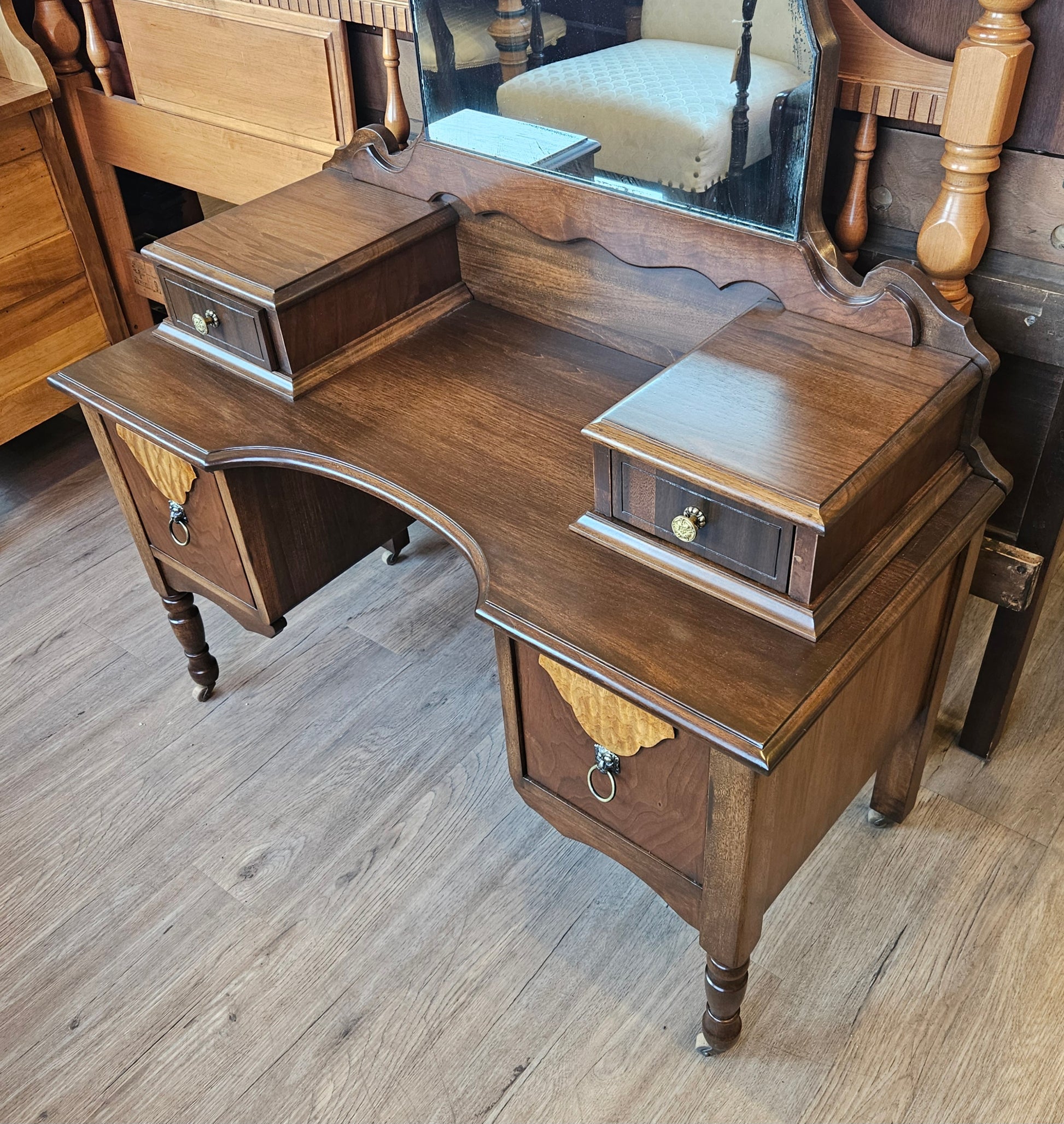 Vanity, shaped mirror, walnut, 2 regular drawers, 2 smaller upper drawers.