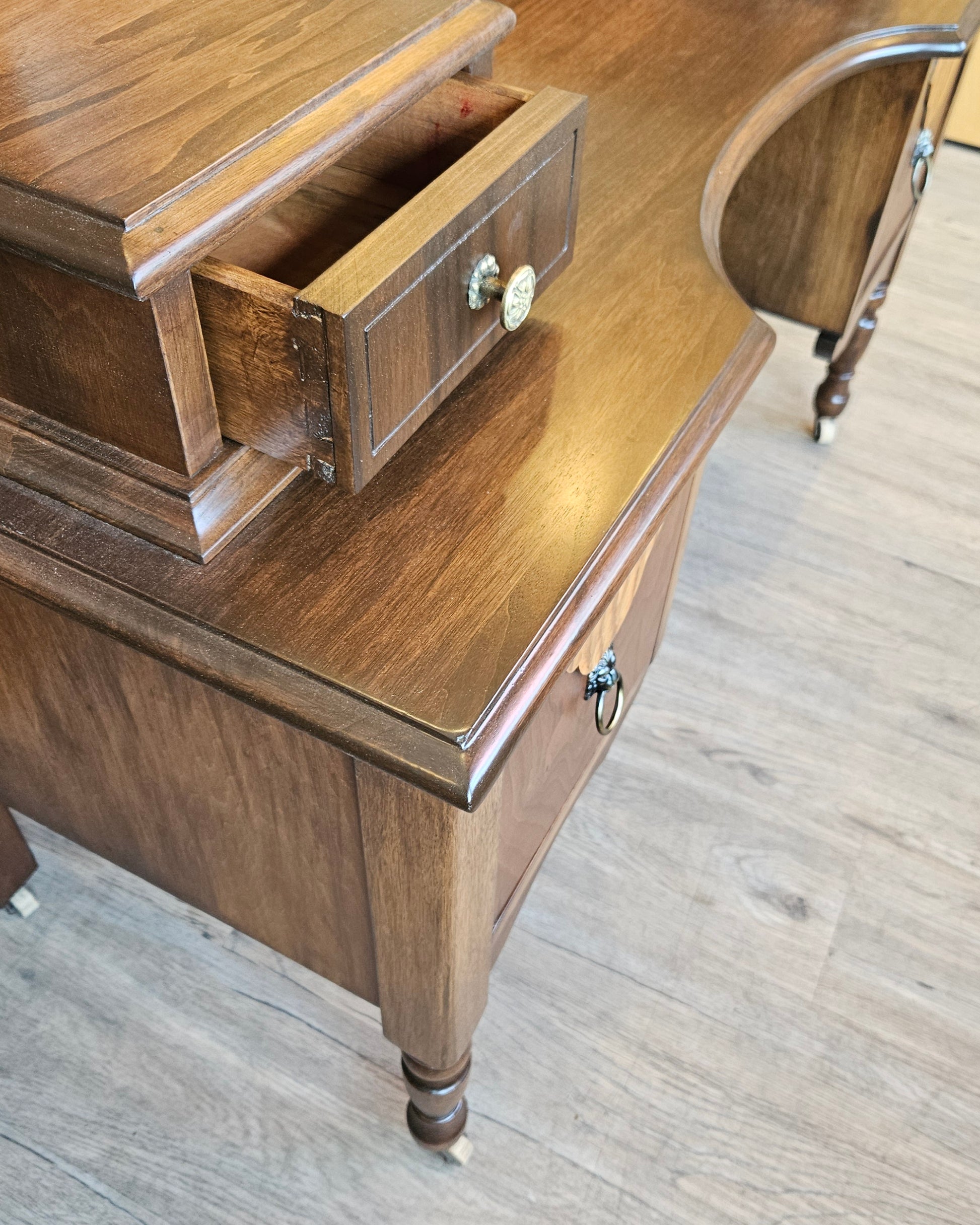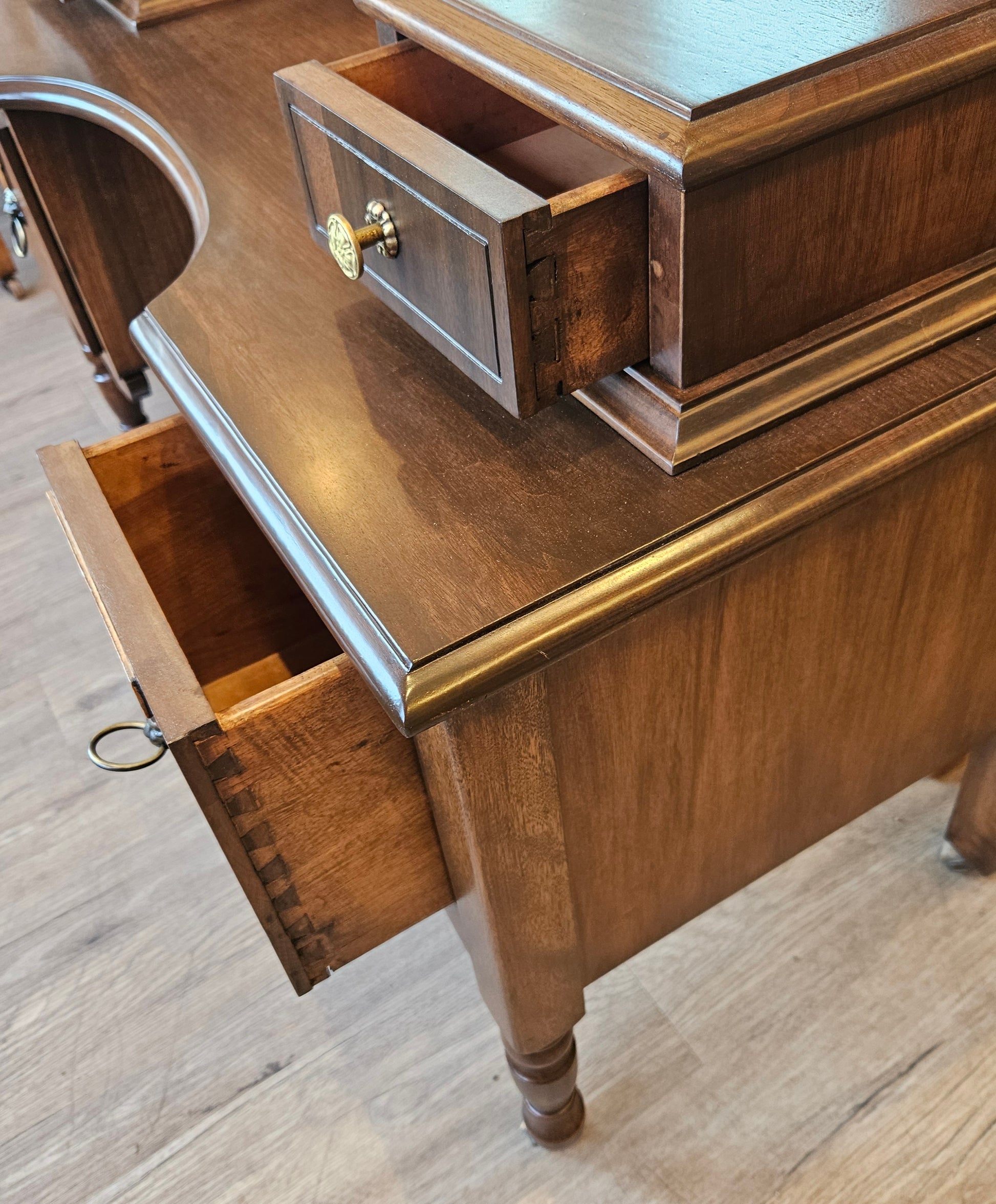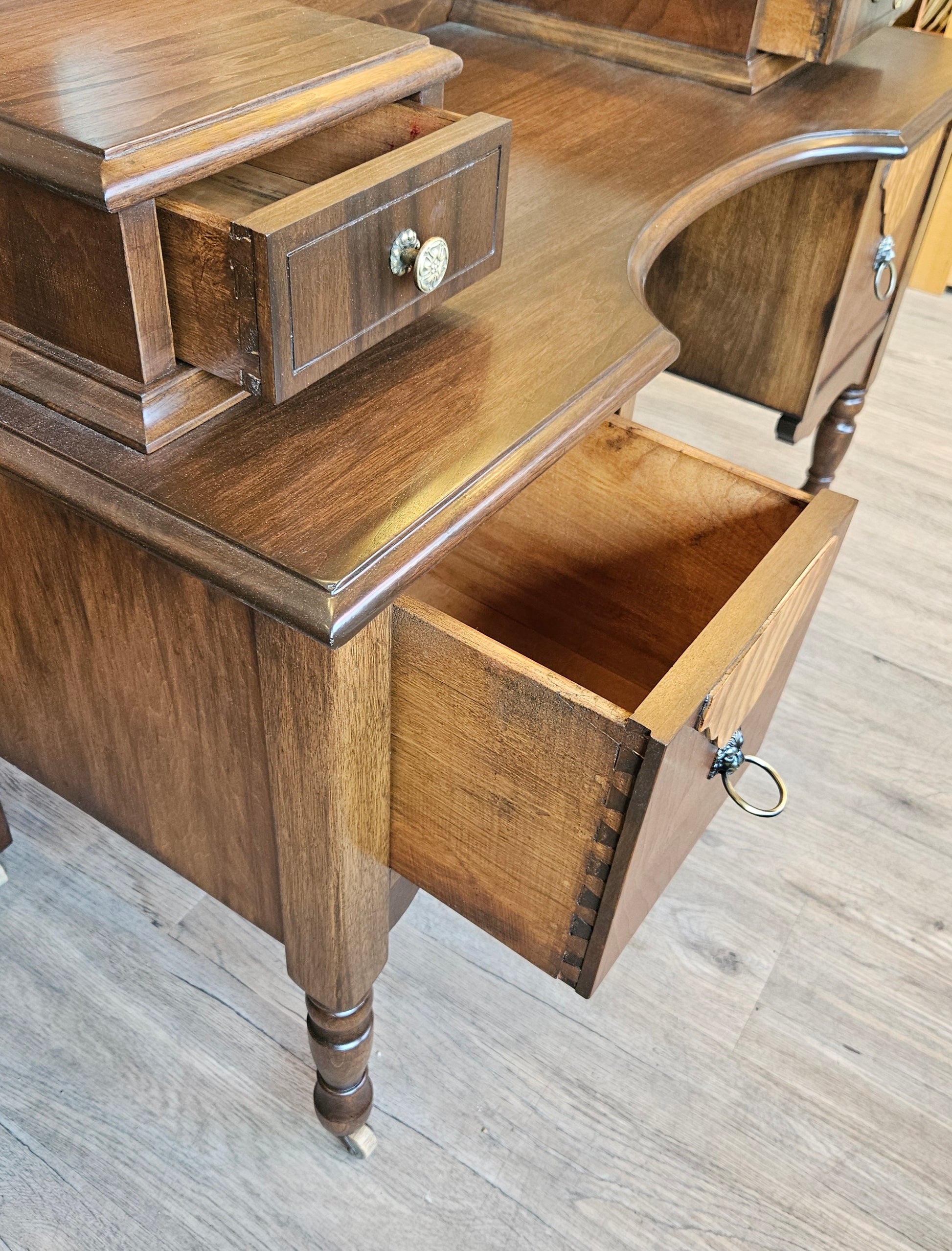 Vanity, shaped mirror, walnut, 2 regular drawers, 2 smaller upper drawers.
