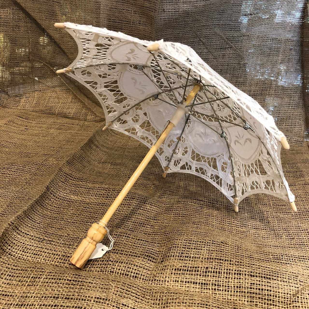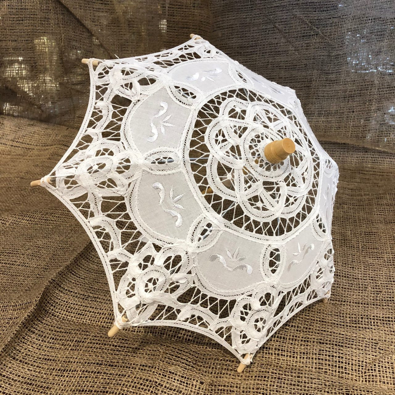 Old-Fashioned White Parasol Umbrella of battenburg lace and with a genuine wood handle.